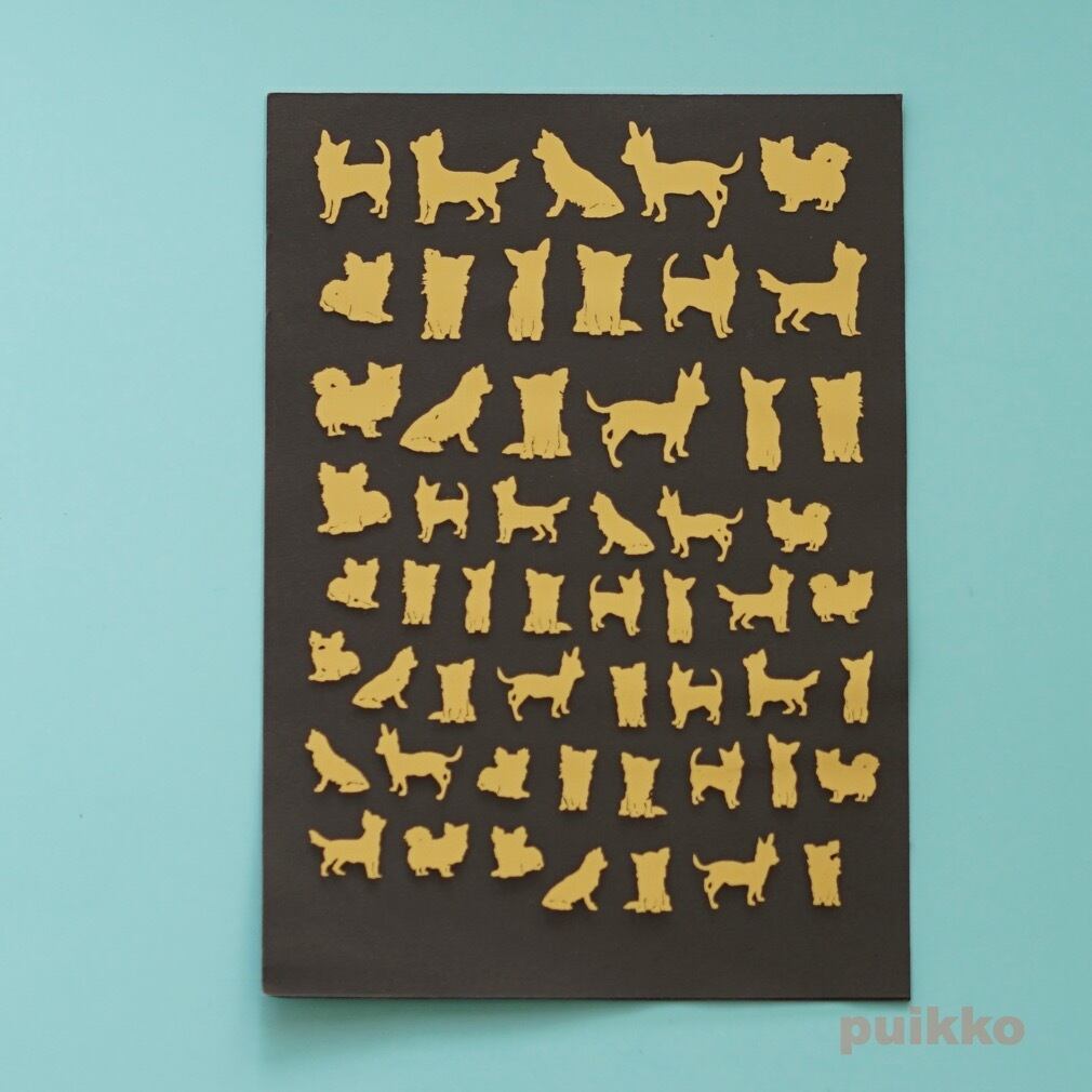 チワワのシルエットイラストをOHPフィルムにモノクロで印刷し、金の箔を押しました。