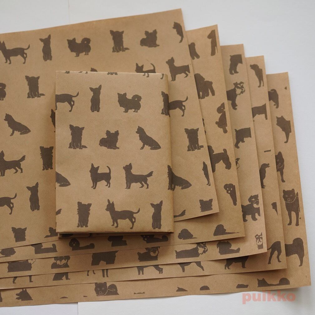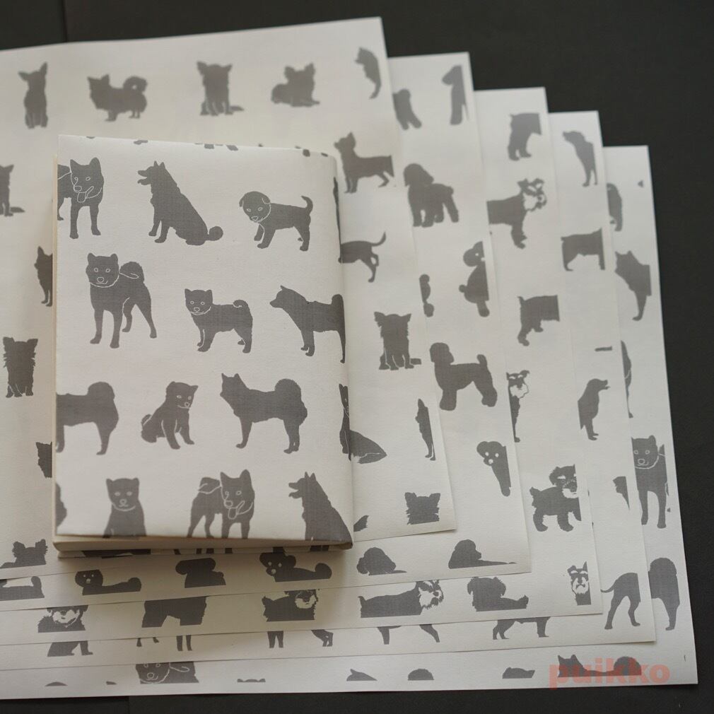 いろいろな犬のシルエットイラストをモノクロ印刷した紙製ブックカバーです。
