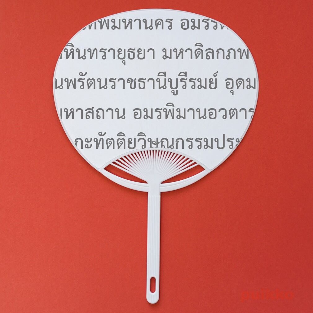 書かれているのはタイの首都バンコクの正式名称「クルンテープ・マハーナコーン・アモーンラッタナコーシン・マヒンタラーユッタヤー・マハーディロックポップ・ノッパラット・ラーチャタニーブリーロム・ウドムラーチャニウェートマハーサターン・アモーンピマーン・アワターンサティット・サッカタッティヤウィサヌカムプラシット」。うちわの形状に合わせてトリミングしてあります。