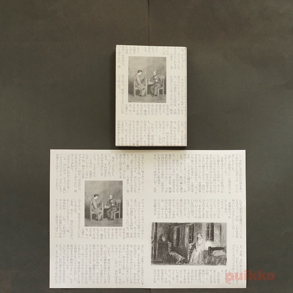 「罪と罰」の日本語翻訳文と挿絵を使った紙製ブックカバーです。