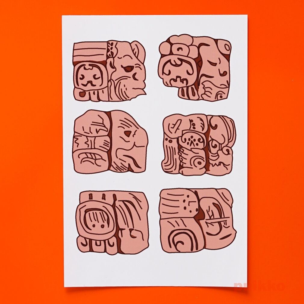 中米マヤ地域で紀元前3世紀ころから紀元後16世紀まで用いられていたマヤ文字。表音文字と表意文字の混合文字であり、他の文字にはない独特な造形が魅力。碑文・壁画・絵文書などが残っています。