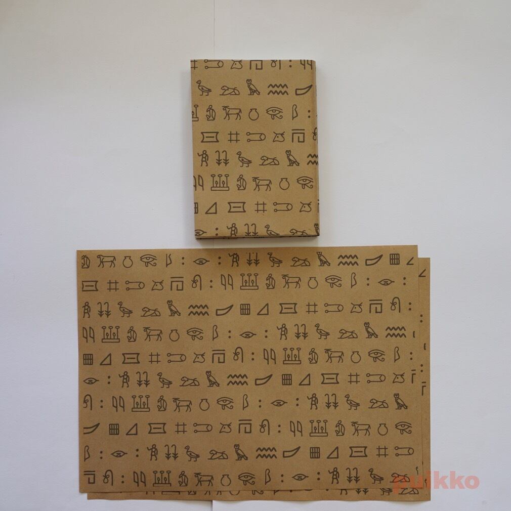古代エジプトで使われていた文字ヒエログリフを使った紙製ブックカバーとしおりのセットです。