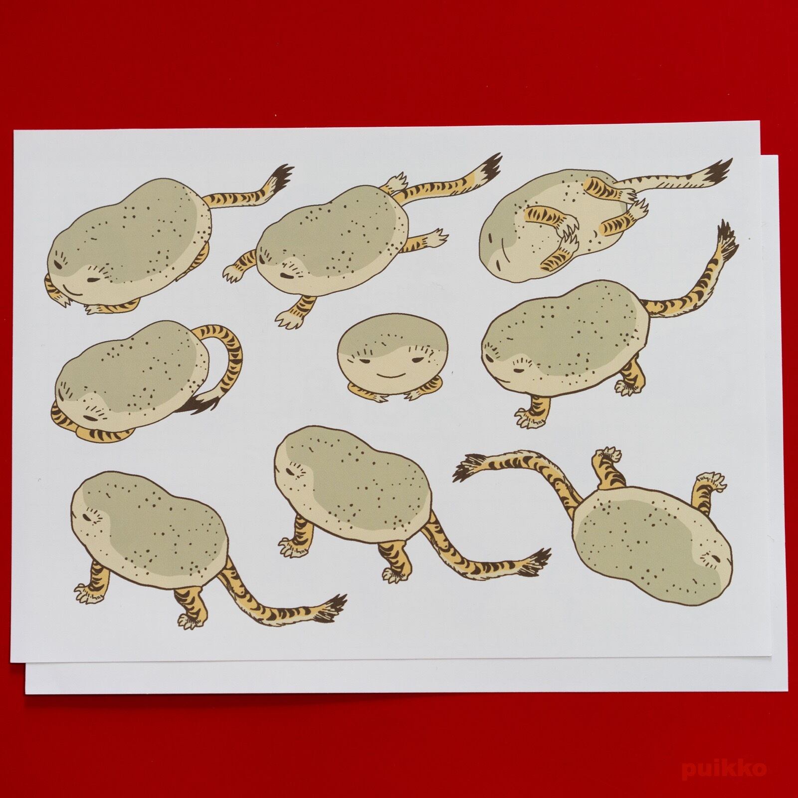歌川芳員(よしかず)は江戸時代末期から明治初期にかけて活躍した浮世絵師。「東海道五十三次内 大磯 をだハらへ四リ」の中に描かれている、大きな石から虎の手足と尻尾がはえた謎のキャラクター虎子石。この虎子石をトレースしてシールにしました(写真下の3点)。また、オリジナルの虎子石をもとに、正面、横向き、伏せているところなどアレンジして描いたもの6点を加えました。
