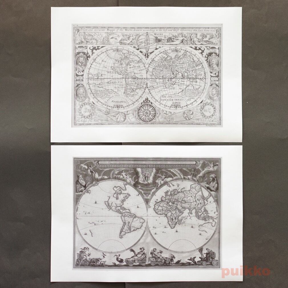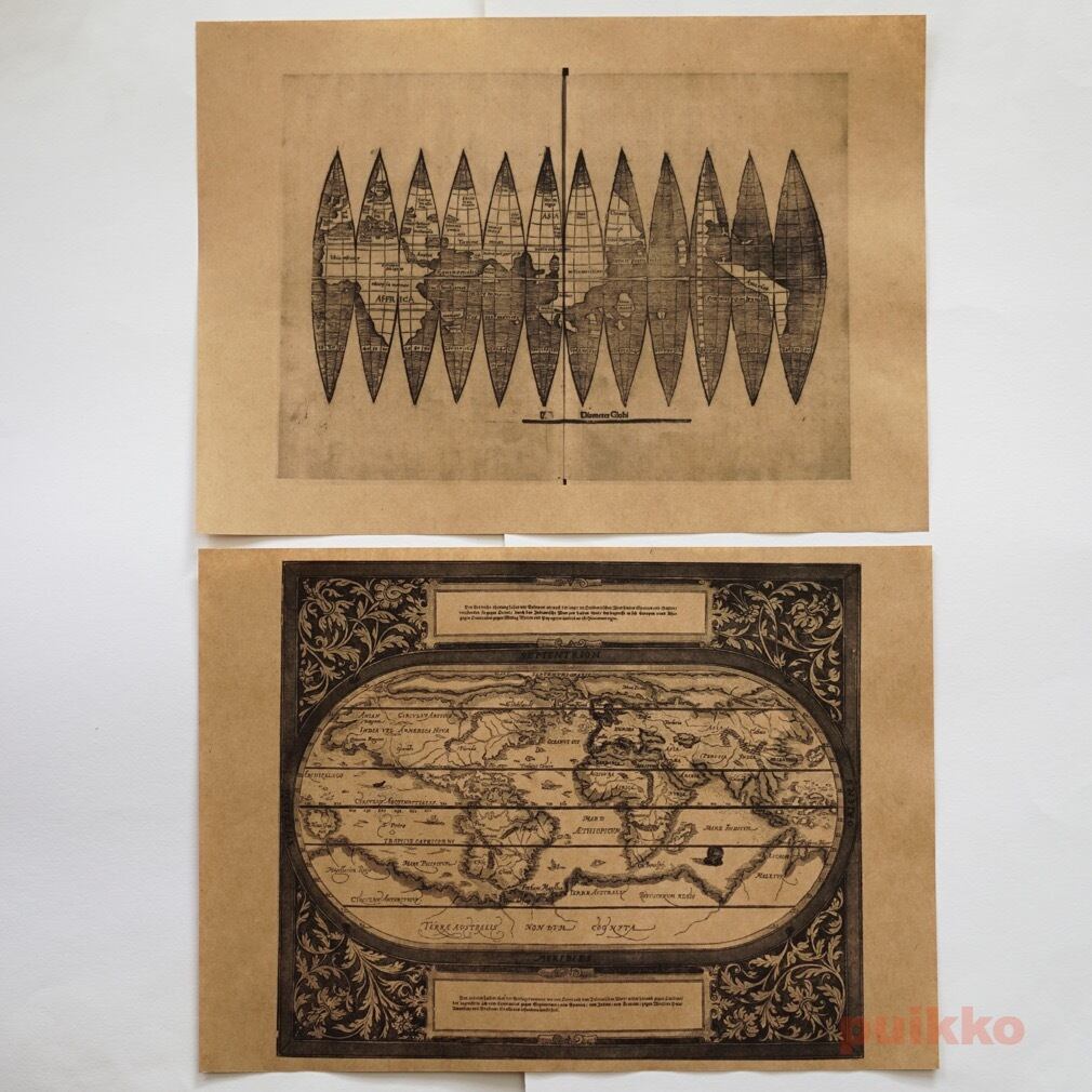 16、17世紀の世界地図をもとにモノクロ印刷しました。周囲に余白がありますが、文庫本用に天地左右を折ったときにちょうど余白が隠れるサイズとなっています。