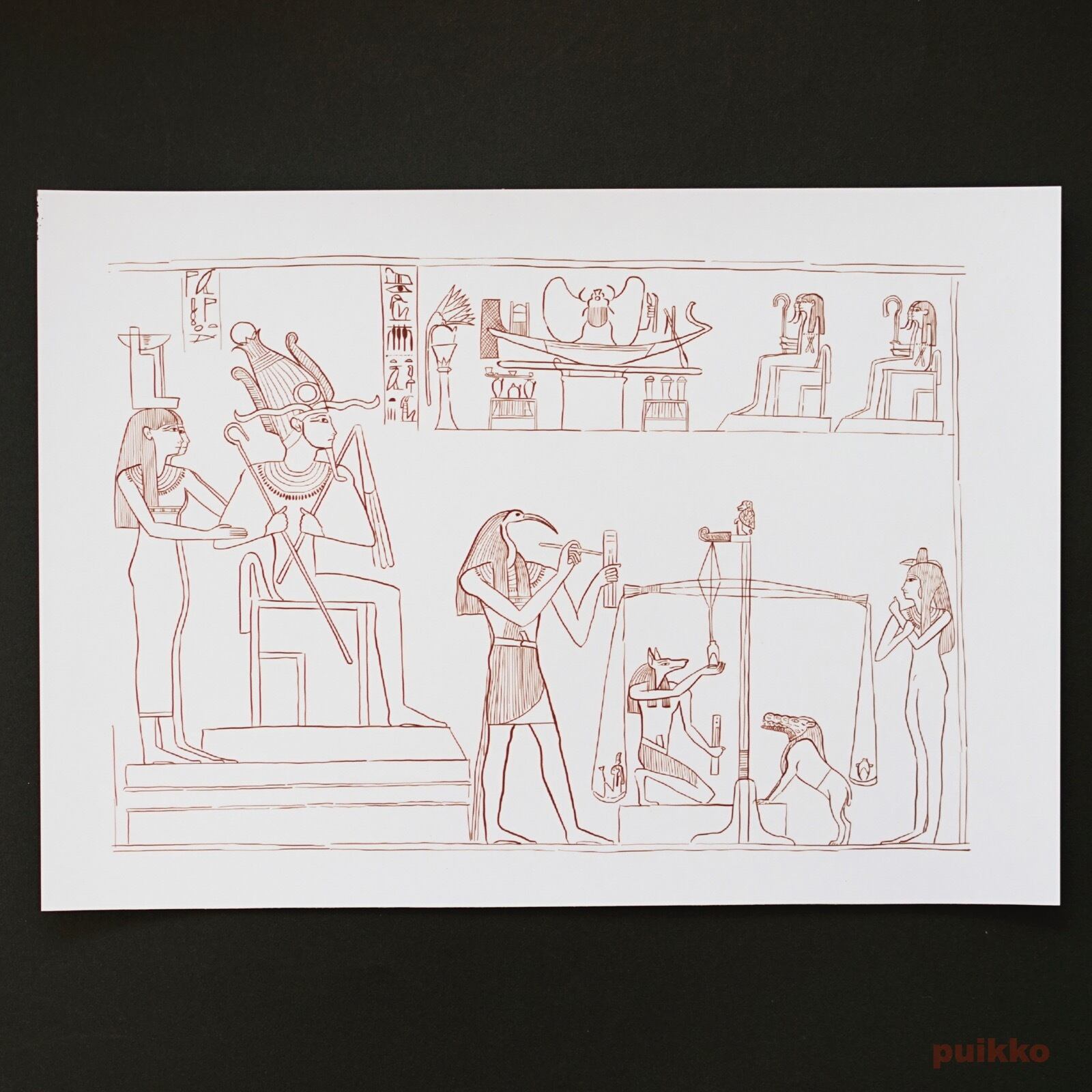 1.オシリスの前でトトが死者の心臓の重さを量る場面