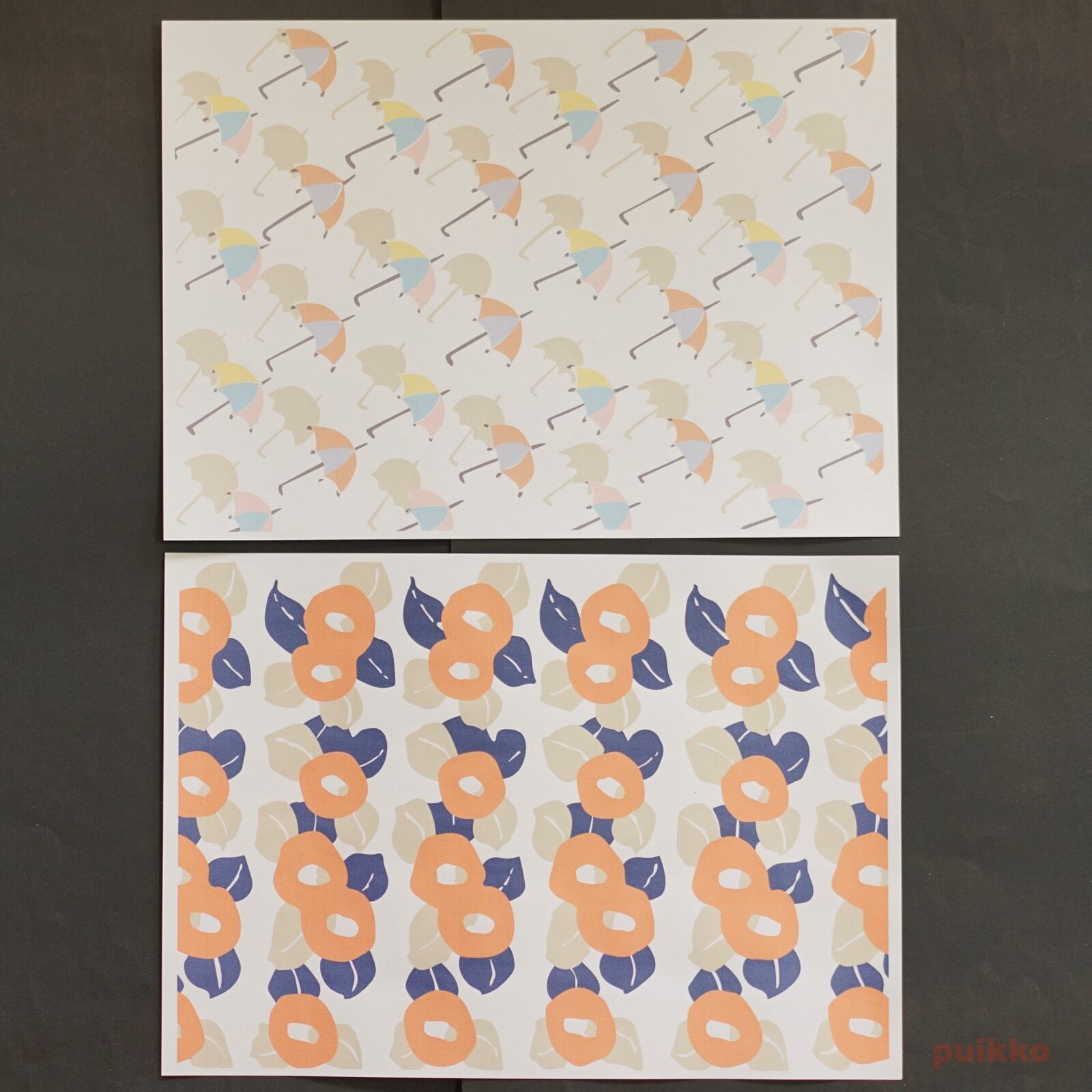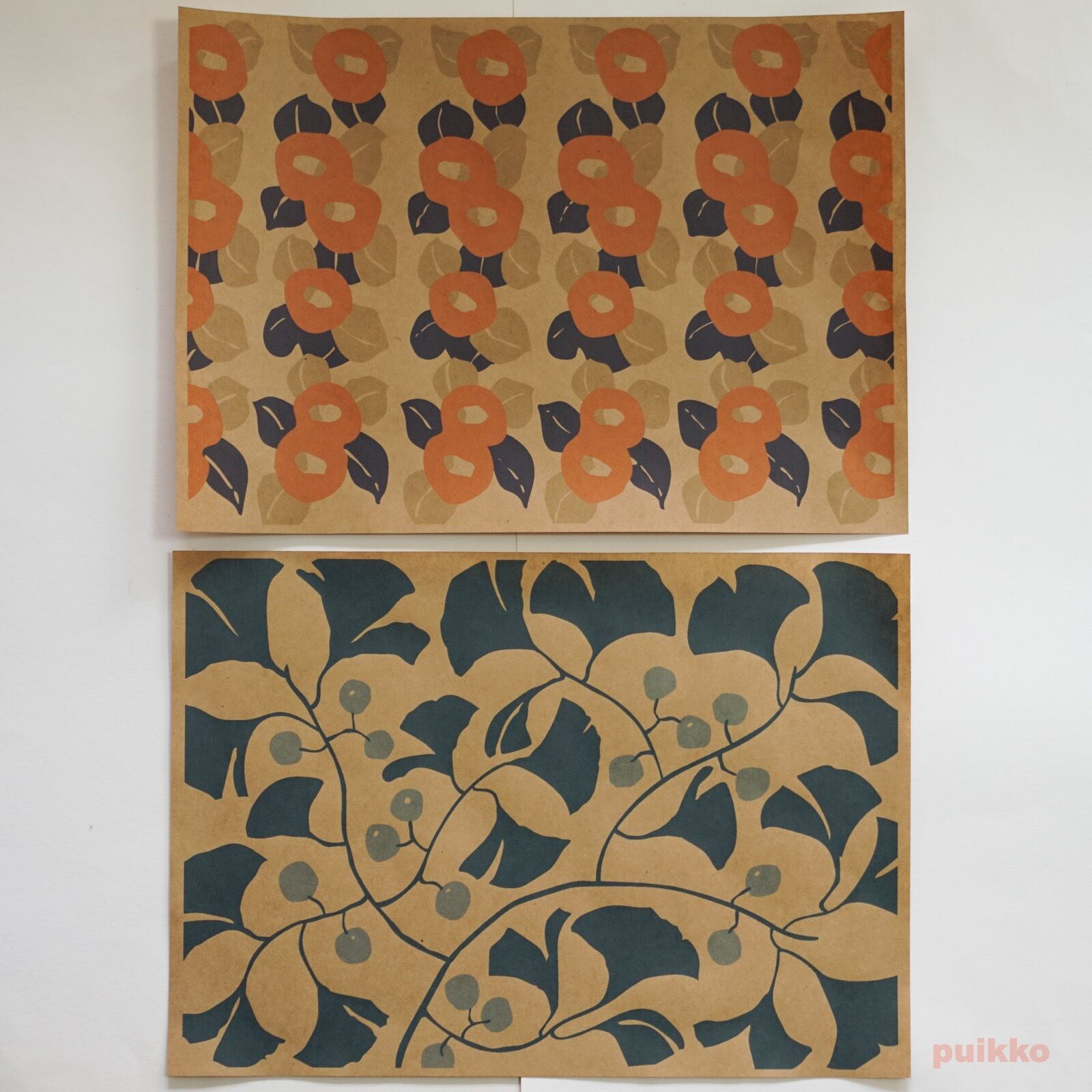 竹久夢二は大正期に活躍した画家。美人画で有名ですが、それだけでなく本の装丁などのグラフィックデザイン、絵葉書、絵封筒など雑貨の制作とさまざまな分野で活躍しました。竹久夢二の描いた千代紙などの絵5点をトレース、アレンジしました。