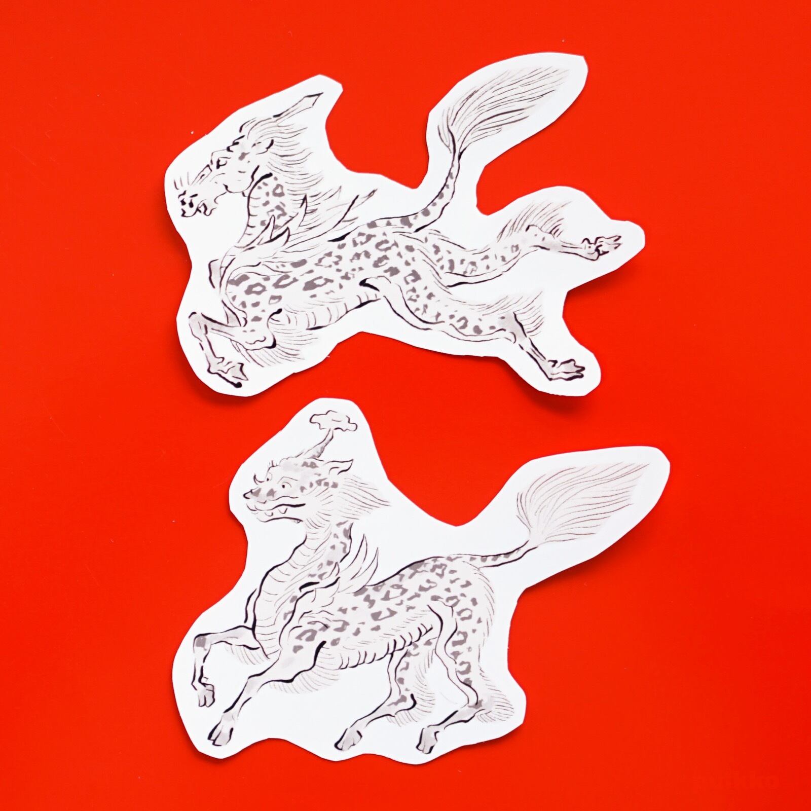 京都の高山寺に伝わる絵巻物「鳥獣戯画」。日本最古の漫画ともいわれているこの作品、甲乙丙丁の4巻から成り、このうちうさぎ、猿、カエルなどが擬人化して描かれた甲巻が最も有名です。乙巻では実在の動物と空想上の動物がリアルなタッチで描かれています。この乙巻で描かれている麒麟(きりん)の絵2点をトレースしてシールにしました。