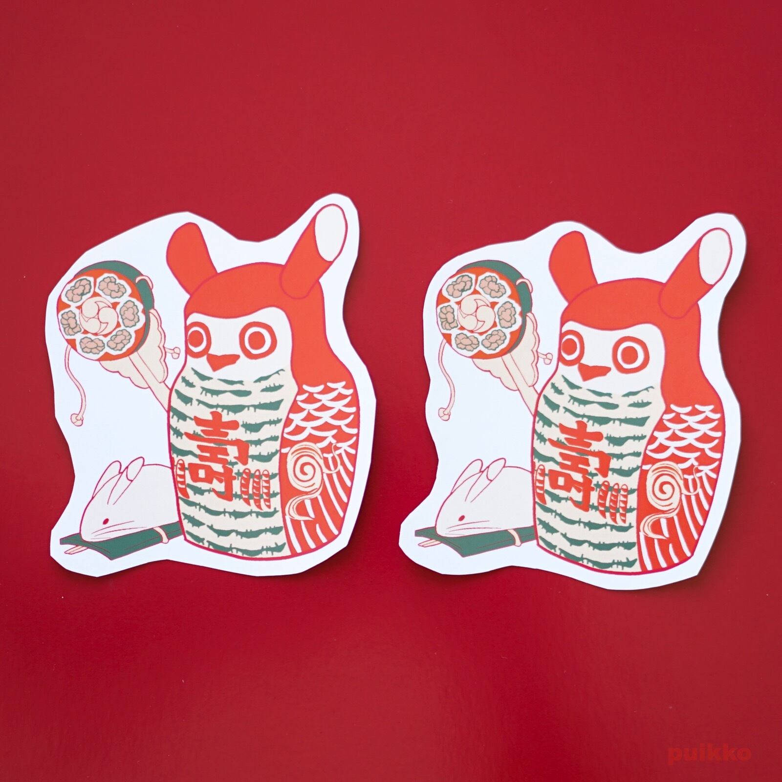 歌川国芳が描いた疱瘡絵(ほうそうえ)「みみずく・兎」の絵のシールタイプステッカーです。同じもの2枚で1セットとなっています。