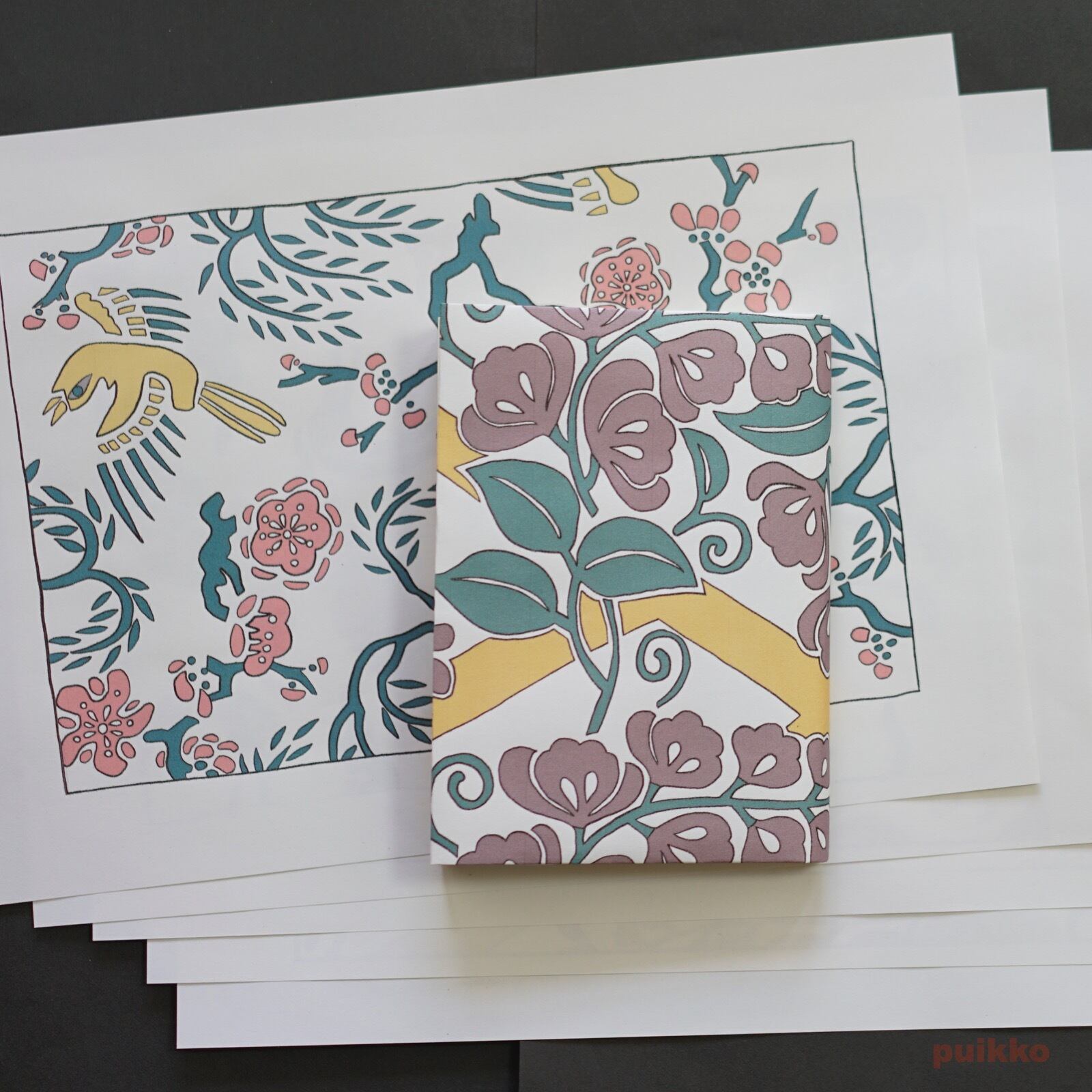 求古図譜 織文之部(きゅうこずふ おりもののぶ)とは、天保11年(1840年)に高島千春(たかしまちはる)という江戸時代の絵師がまとめた図案集。正倉院や法隆寺などの古い文様を紹介したものです。この中から5点をセレクト、トレースしてブックカバーにしました。