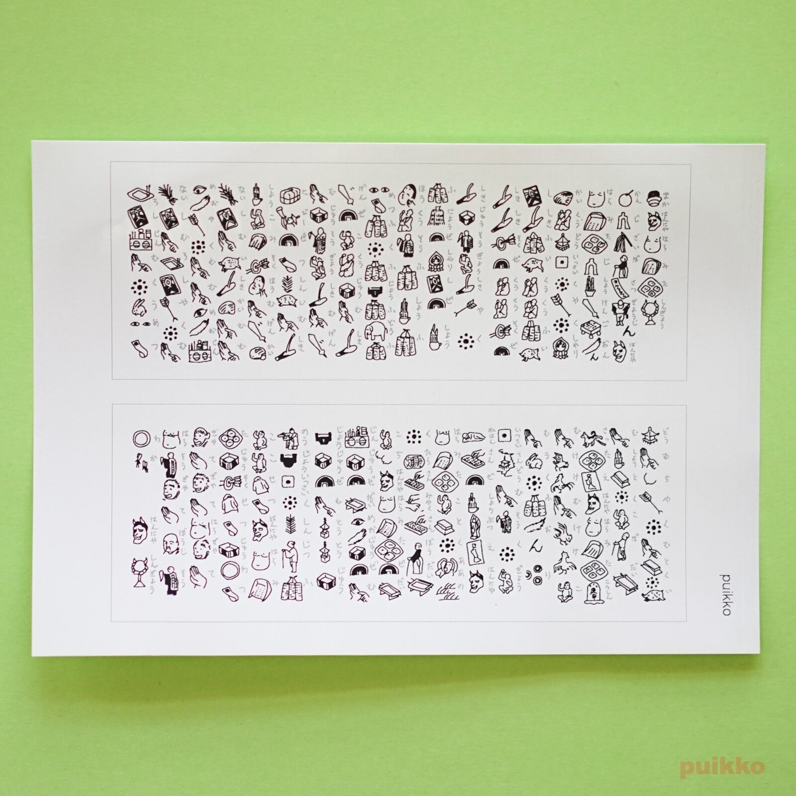 絵般若心経、または絵心経とは、江戸時代、文字の読めない人に向けて文字を絵で表した般若心経。釜を逆さまにして「まか」、般若の面で「はんにゃ」、銭の上半分で「ぜ」、ものを食う絵で「くう」など、ユーモアも交えて描かれています。