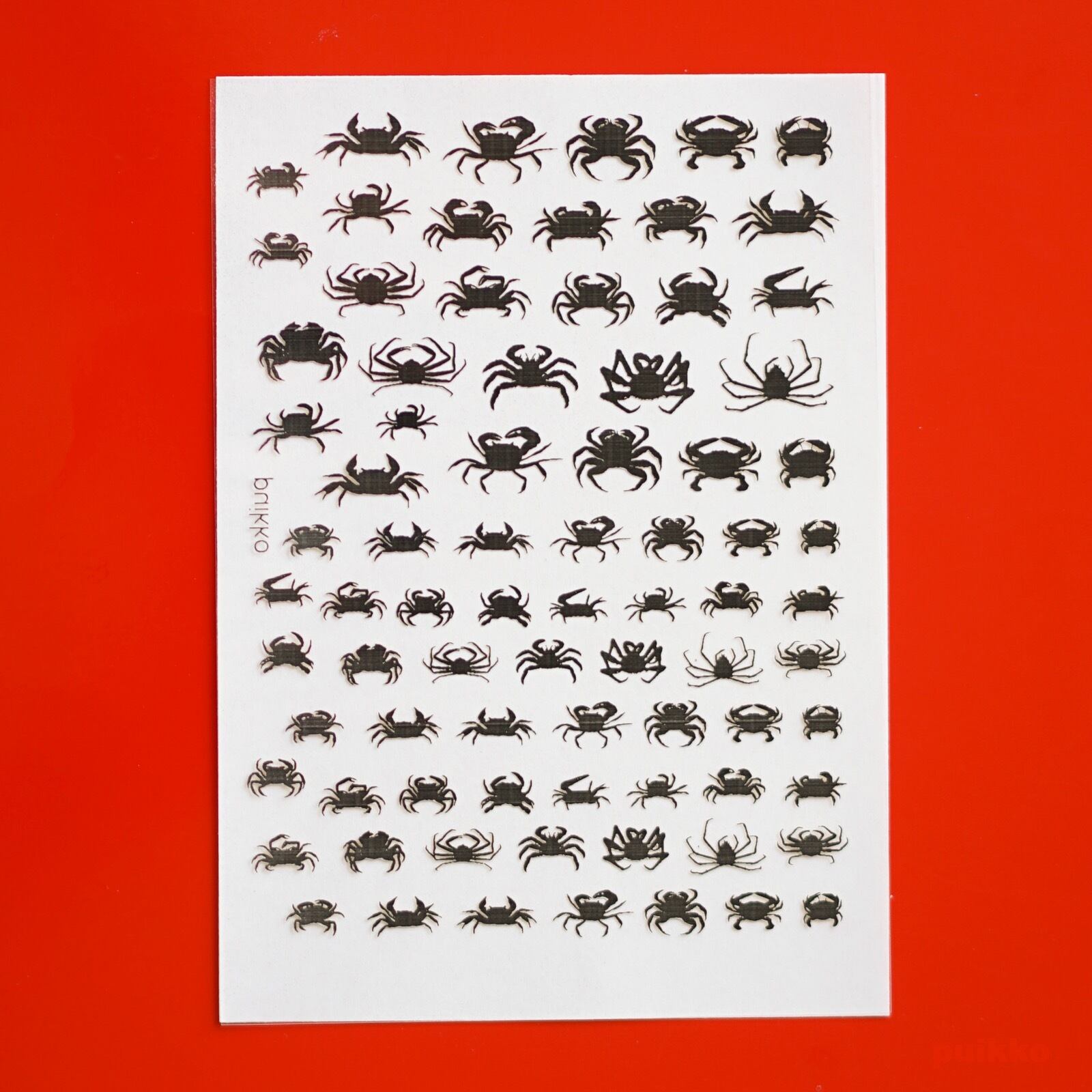 カニのシルエットイラストをOHPフィルムにモノクロで印刷し、金の箔を押しました。