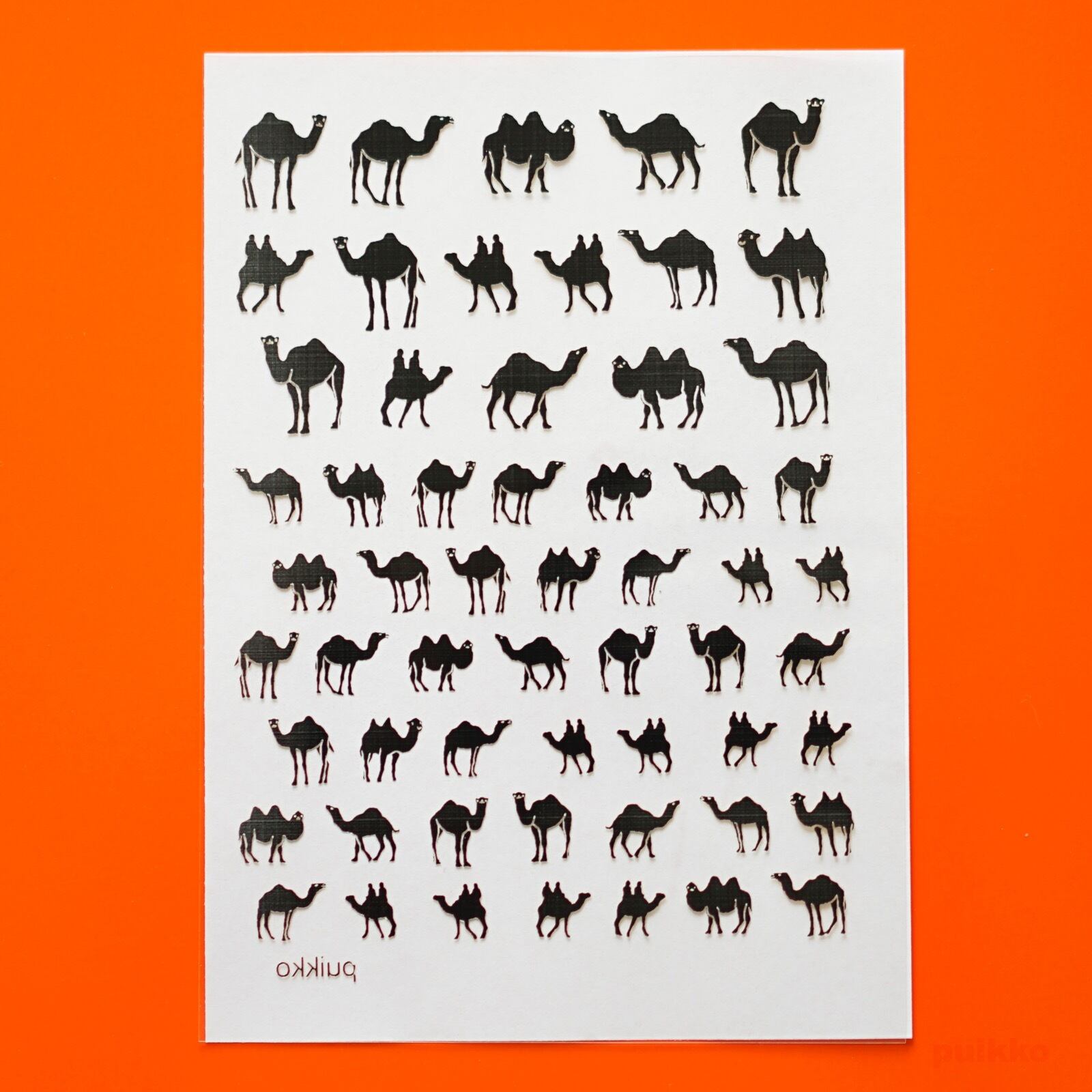 ラクダのシルエットイラストをOHPフィルムにモノクロで印刷し、金の箔を押しました。