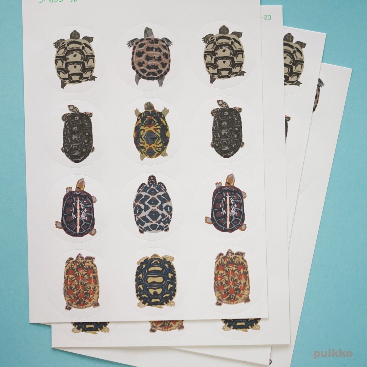 ヒョウモンガメ、パンケーキリクガメ、ホウシャガメ、インドホシガメなど上から見た亀のイラスト8種各6片をシールにしました。