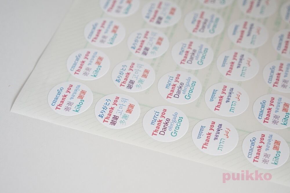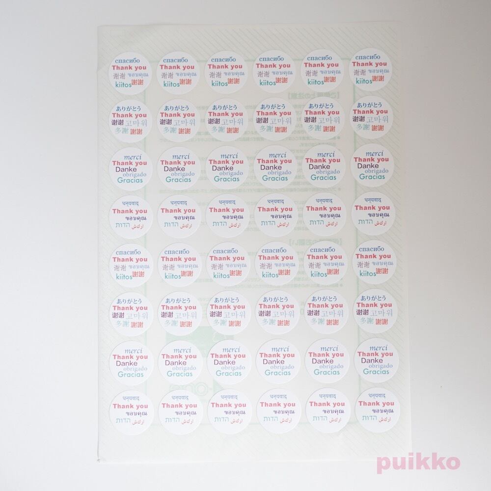 「Thank you」を意味する言葉を英語、日本語をはじめロシア語、タイ語など多数の言語で表し、サンキューシールにしました。