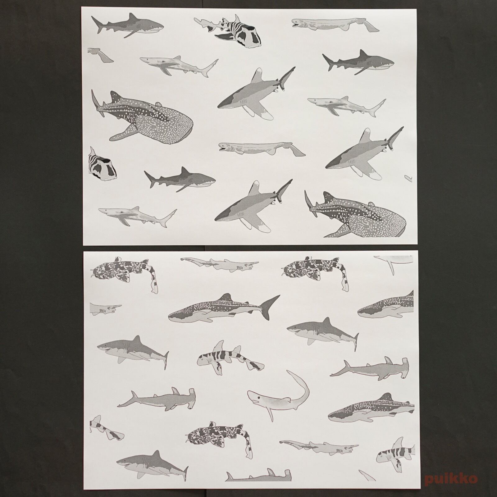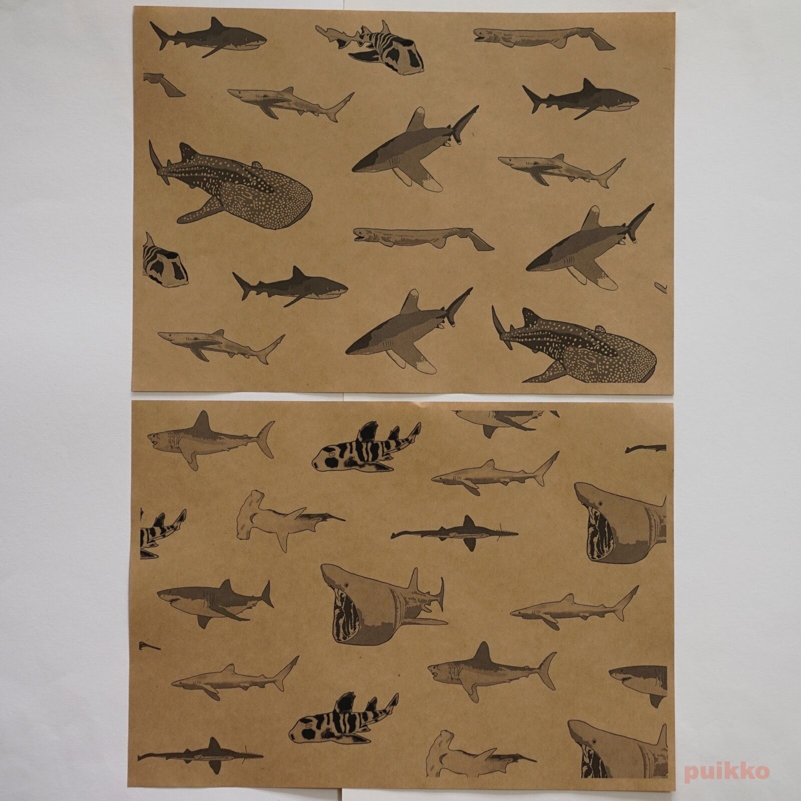 下記のようなさまざまな種類のサメのイラストを使ってブックカバーにしました。