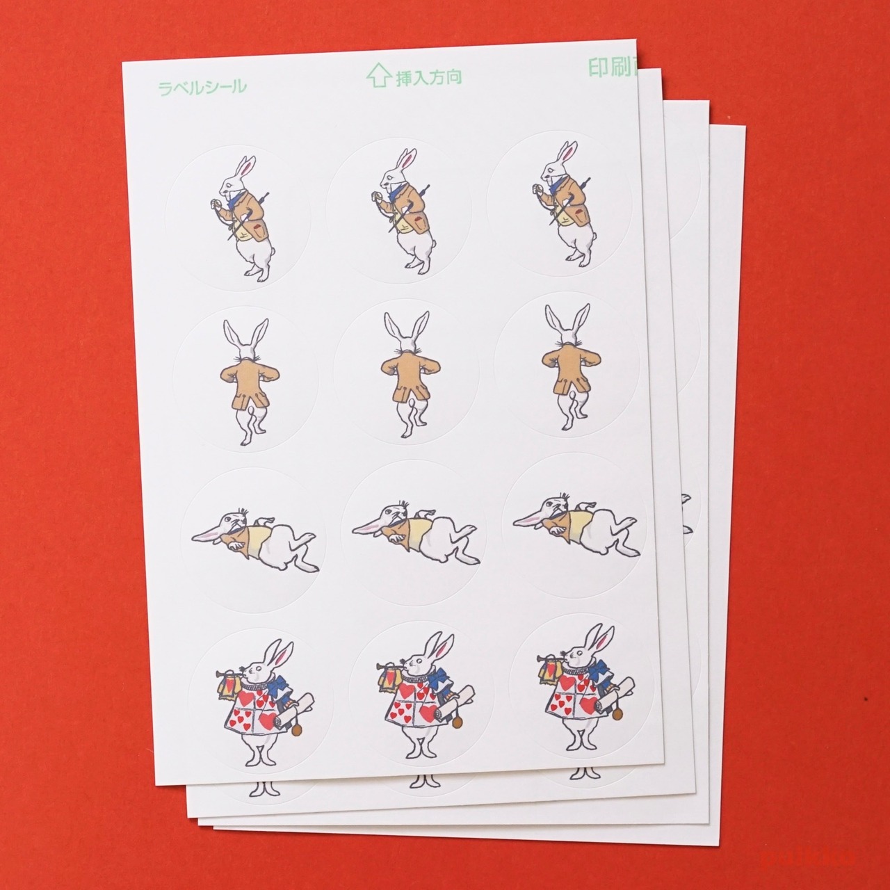 「不思議の国のアリス」に出てくる白うさぎのイラストをラベルシール(直径30mmの丸シール)に印刷しました。