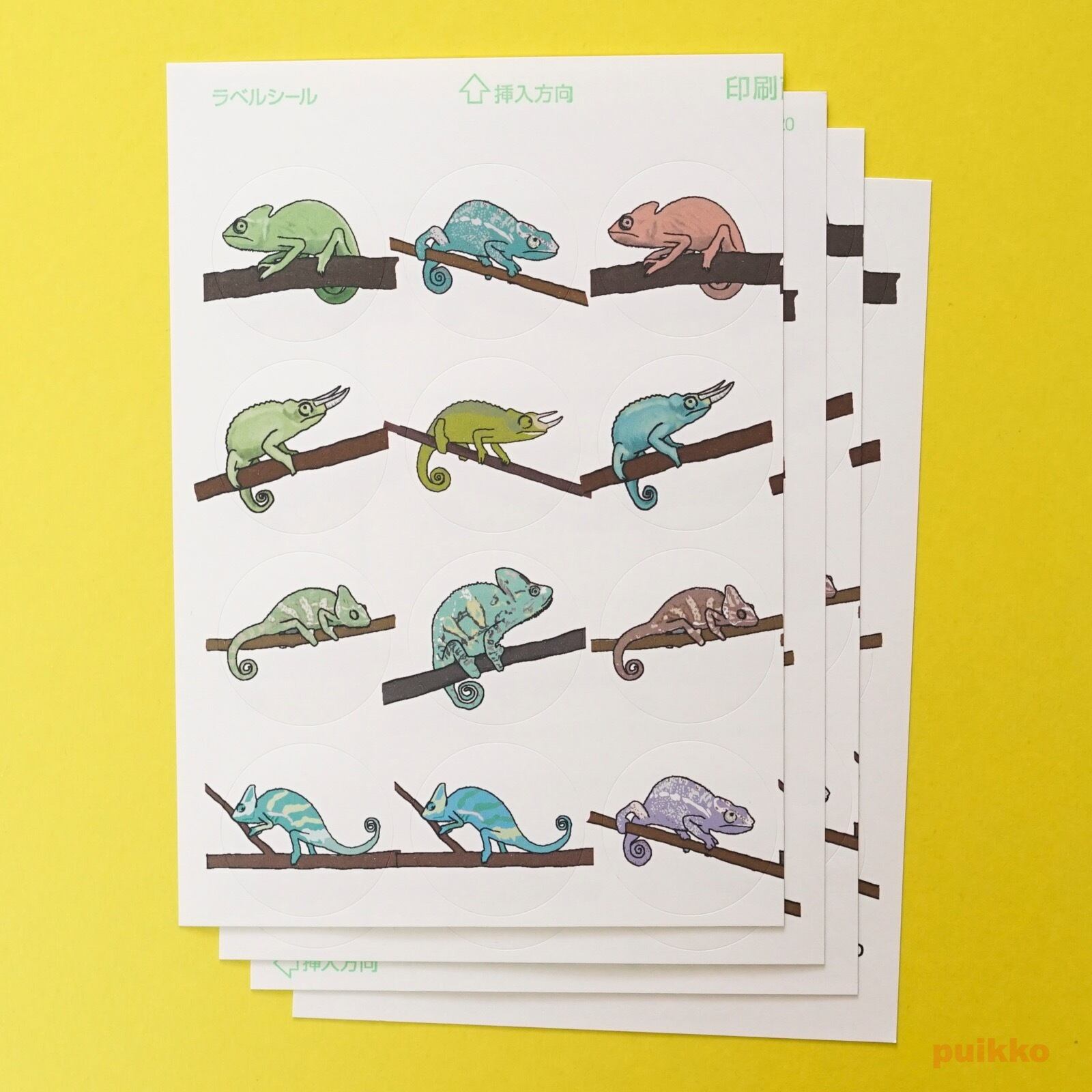 エボシカメレオン、ジャクソンカメレオンのイラスト12種を4片ずつ収録しました。