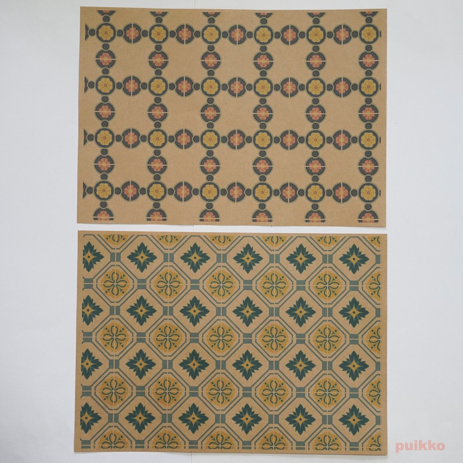 使用した用紙はクラフト紙(ブラウン)と再生紙(コピー紙よりやや厚く、黄味がかった白)の2タイプ。お好みのほうをお選びください。ブックカバーとして使うだけでなく、小物の包装紙、写真撮影の背景紙などアイデア次第でいろいろ活用できます。折らずに発送します。