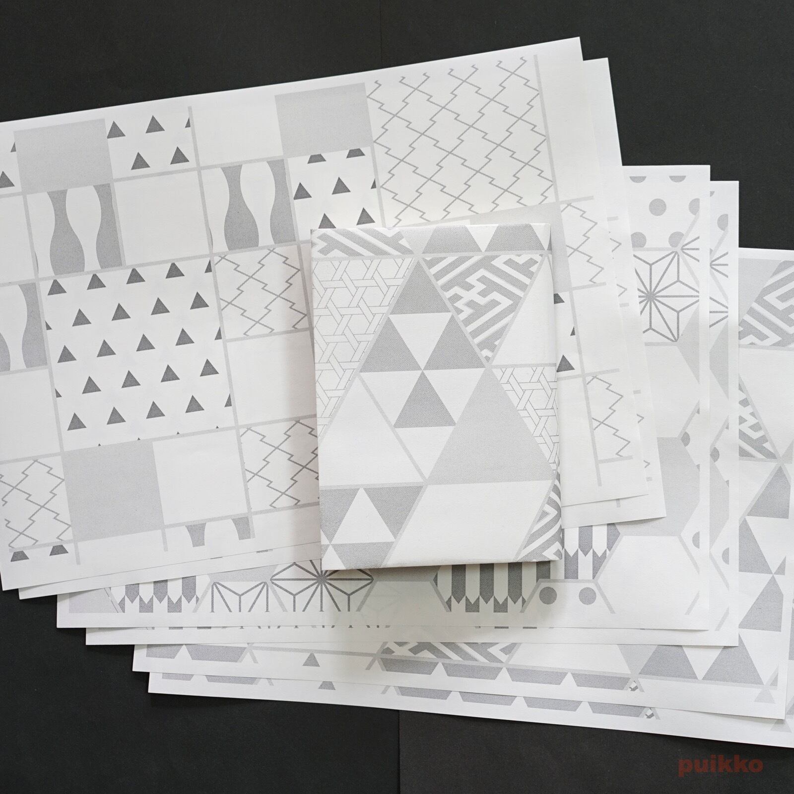 正方形、六角形、三角形の枠線の中に鱗文、松皮菱、立涌、水玉、麻の葉、矢絣、紗綾形、籠目などの和柄パターンを配しました。