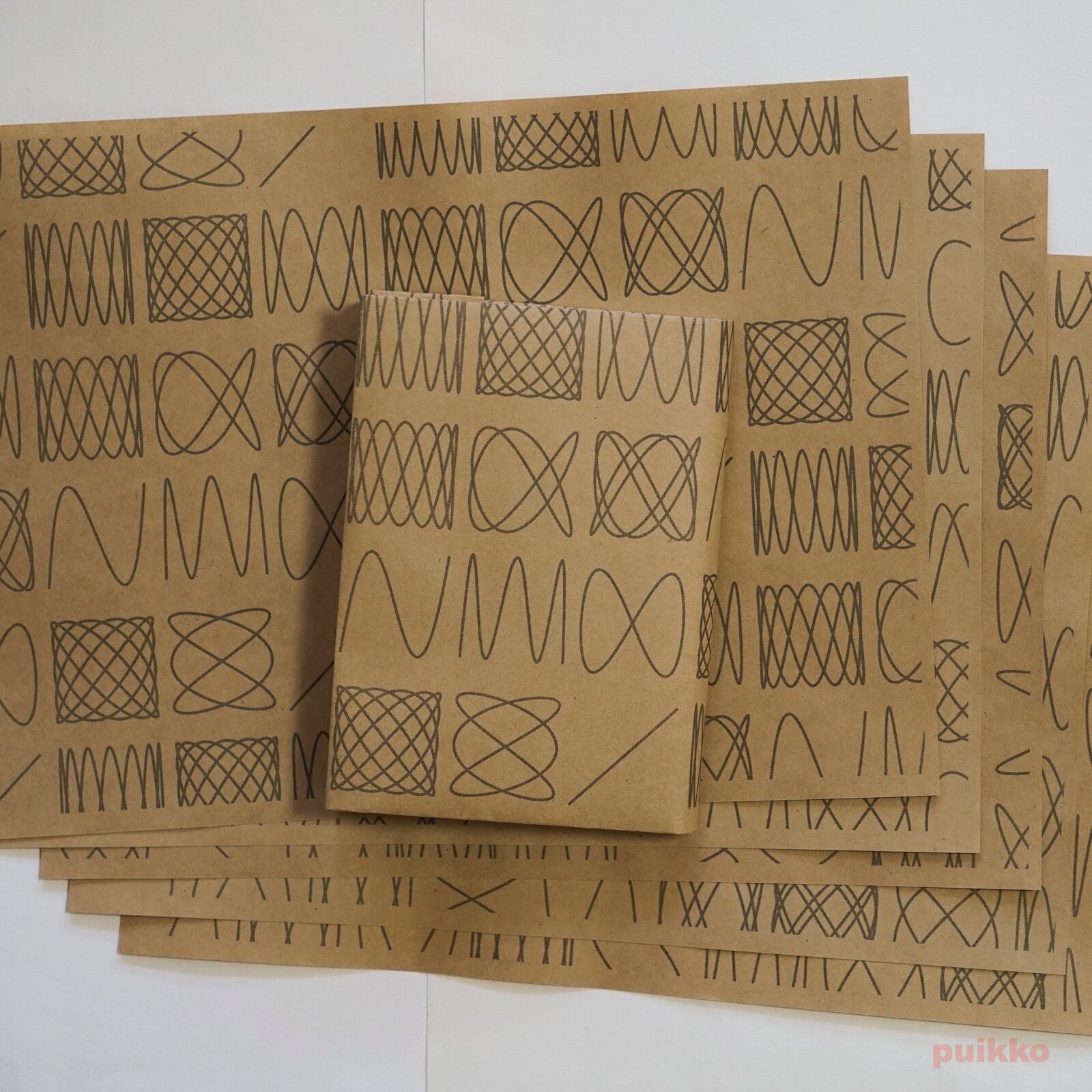 使用した用紙はクラフト紙(ブラウン)と再生紙(コピー紙よりやや厚く、黄味がかった白)の2タイプ。お好みのほうをお選びください。ブックカバーとして使うだけでなく、小物の包装紙、写真撮影の背景紙などアイデア次第でいろいろ活用できます。折らずに発送します。