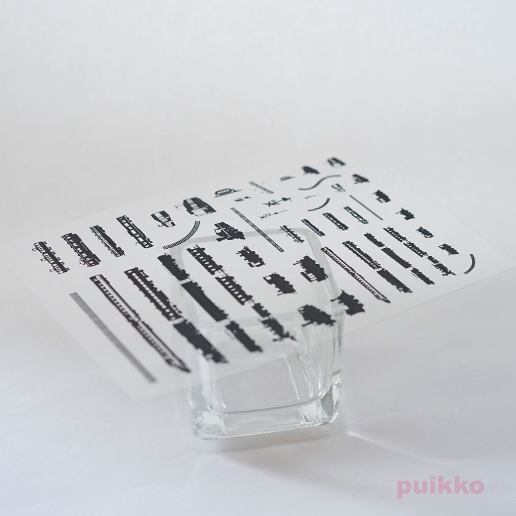 蒸気機関車をメインに電車や線路、踏切の信号など鉄道関係のものをまとめてOHPフィルムにモノクロ印刷しました。