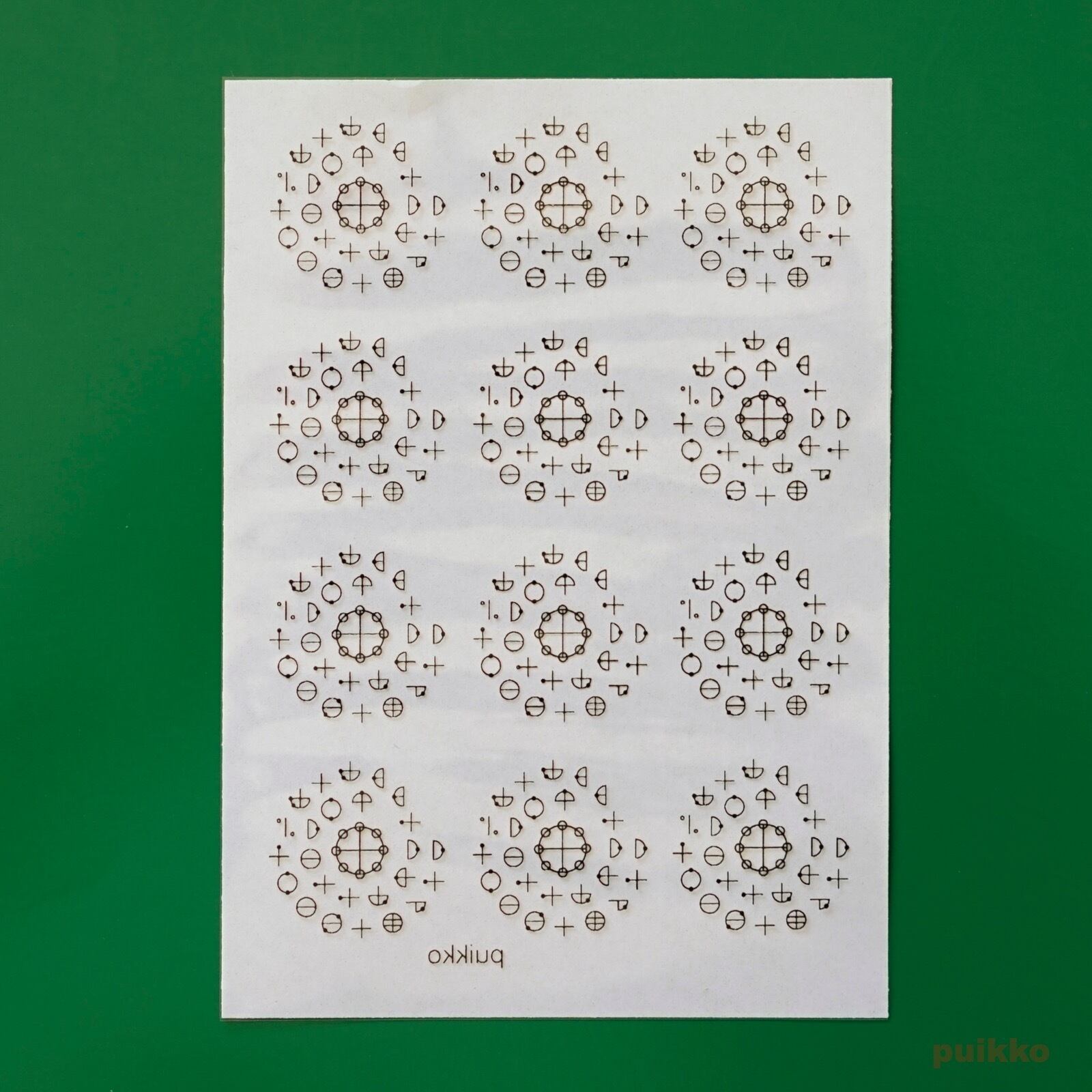 市販のレーザープリンタにOHPフィルムを使って印刷し、箔押ししているので、精密さに欠けるところがあります。