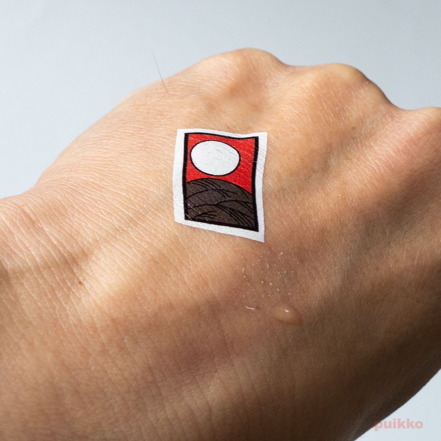 タトゥーシールとして肌につける以外にも、プラスチックや金属など表面がなめらかなものに貼り付けられます。