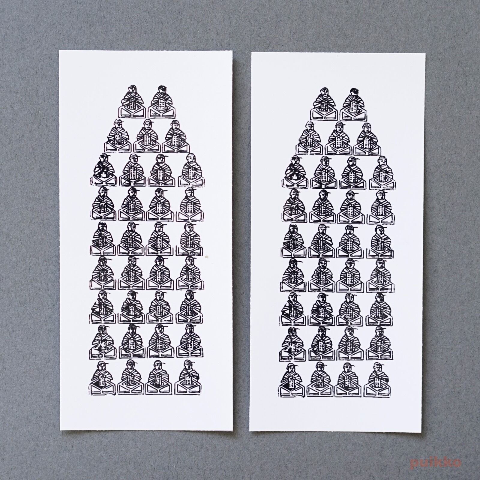 元三大師(がんざんだいし)とは天台宗・比叡山延暦寺の中興の祖 良源の通称。中世以降「厄除け大師」として信仰を集めています。ステッカーにしたのは、「豆大師」(まめだいし)と呼ばれ、33体の小さな元三大師の姿が描かれたものです。33という数は観音菩薩の三十三変身に由来しています。このお姿を刷ったおふだは魔除けとして知られ、特に江戸時代以降、日本中の家々の入口に貼られてきました。