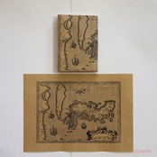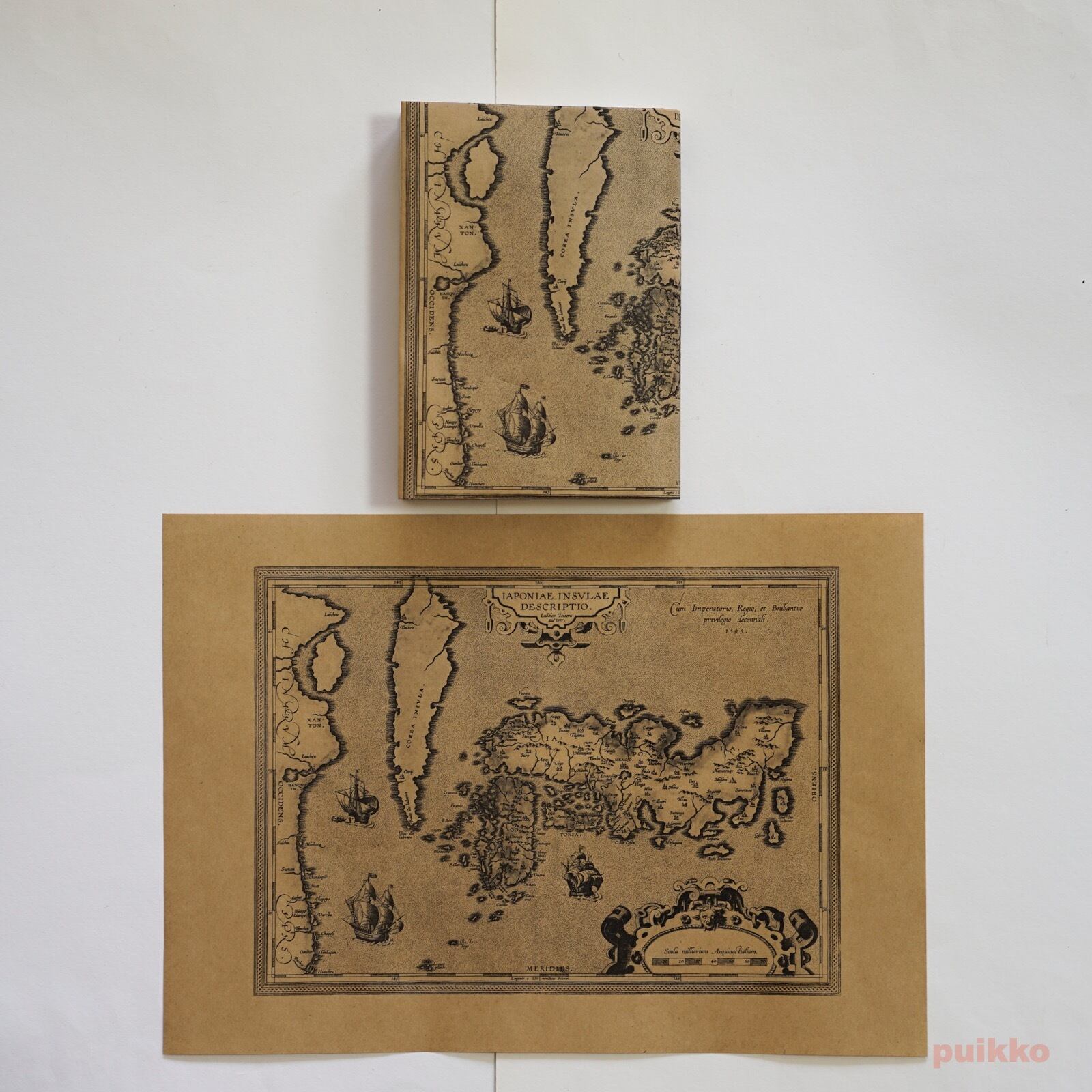 主に17世紀に西洋人によって描かれた日本地図をもとにモノクロ印刷しました。周囲に余白がありますが、文庫本用に天地左右を折ったときにちょうど余白が隠れるサイズとなっています。