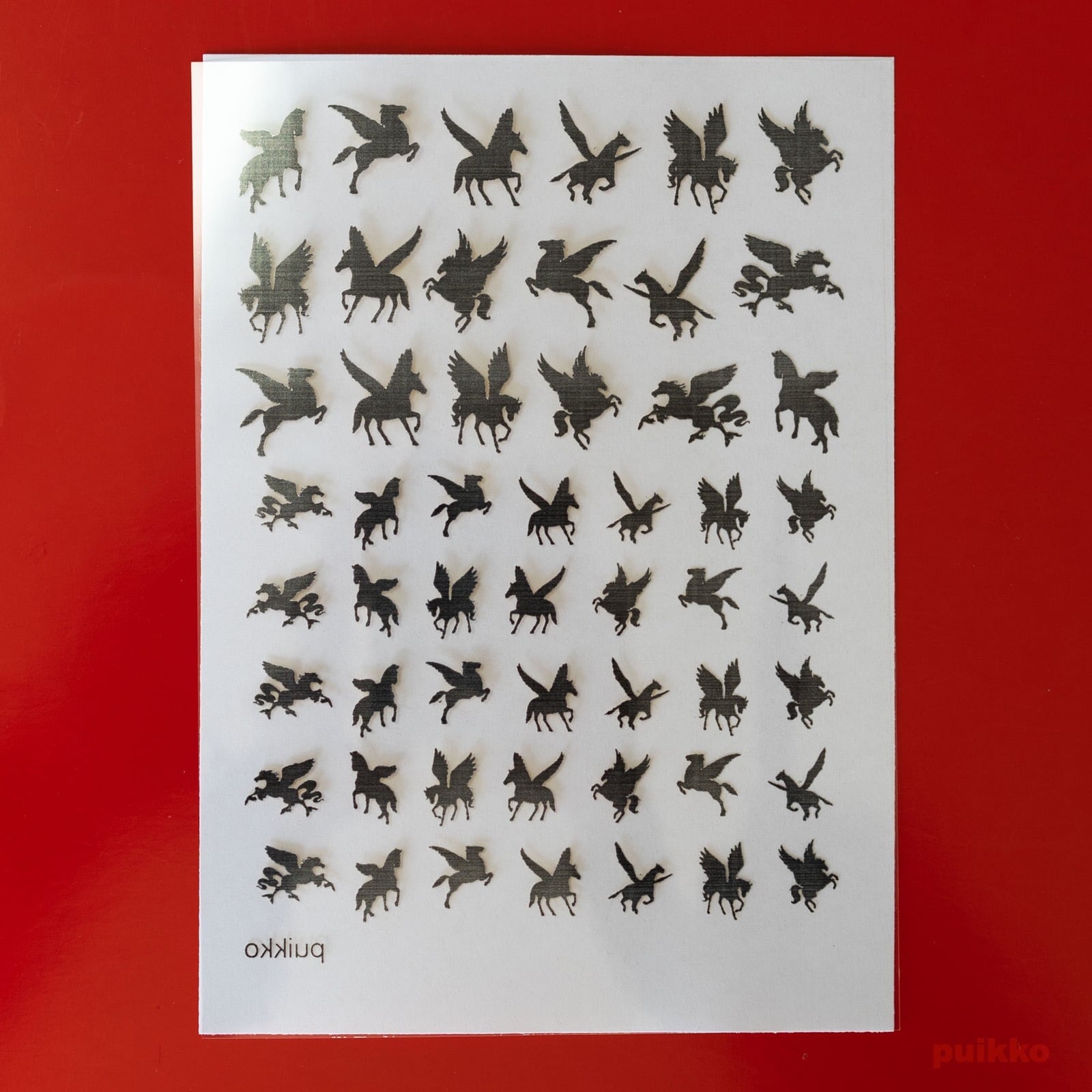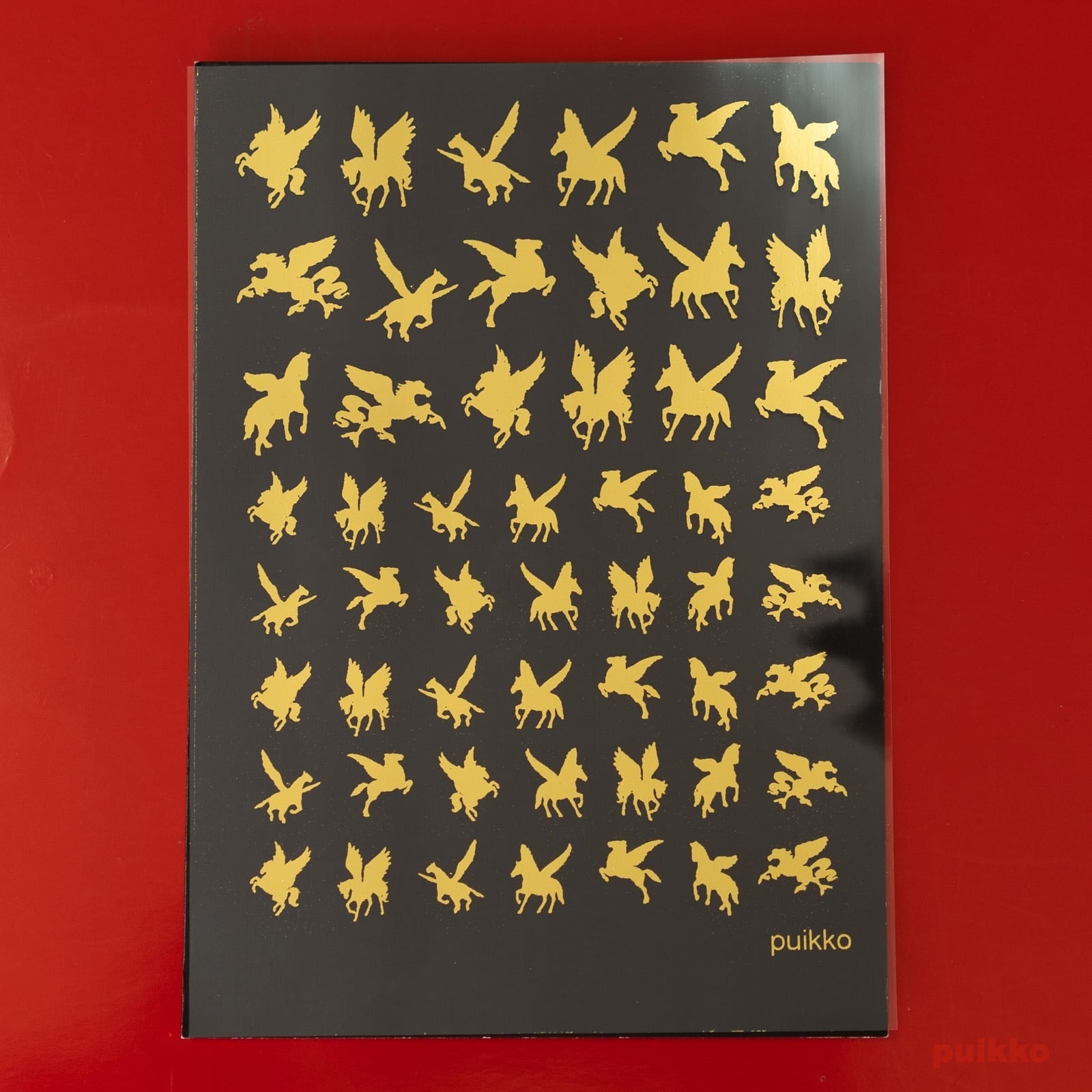 伝説の生物 ペガサスのシルエットイラストをOHPフィルムにモノクロで印刷し、金の箔を押しました。