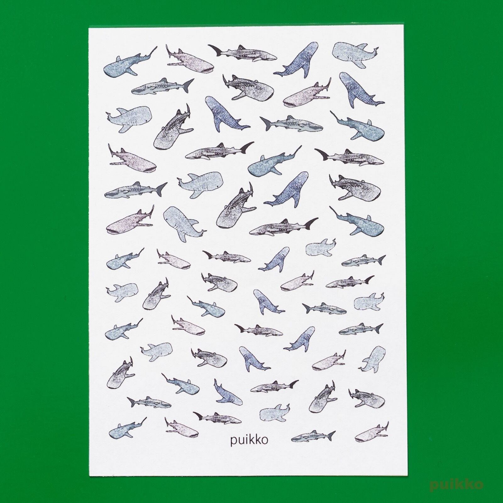原生魚類で最大の動物 ジンベエザメのイラスト7種を、サイズにバリエーションをつけて収録しました。