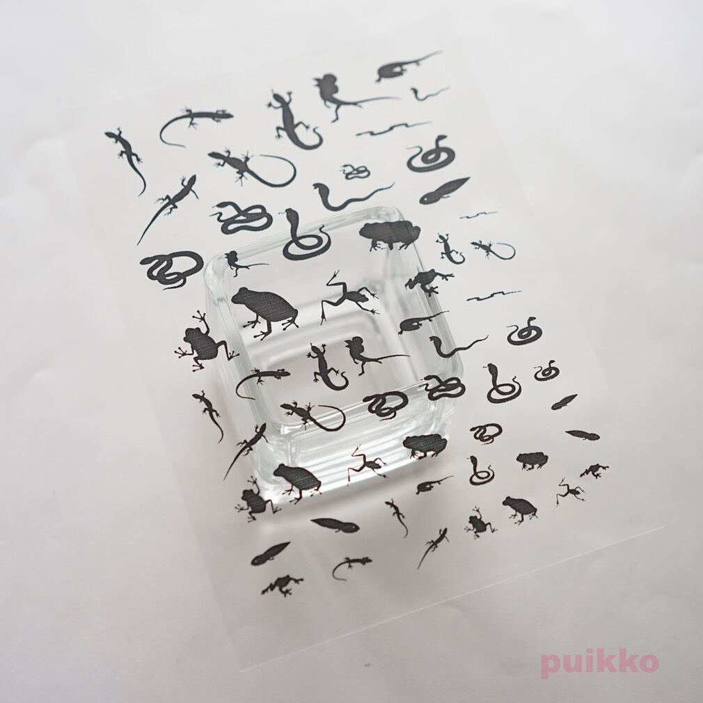 トカゲ、ヘビ、カエルのシルエットイラストをまとめてOHPフィルムにモノクロで印刷しました。