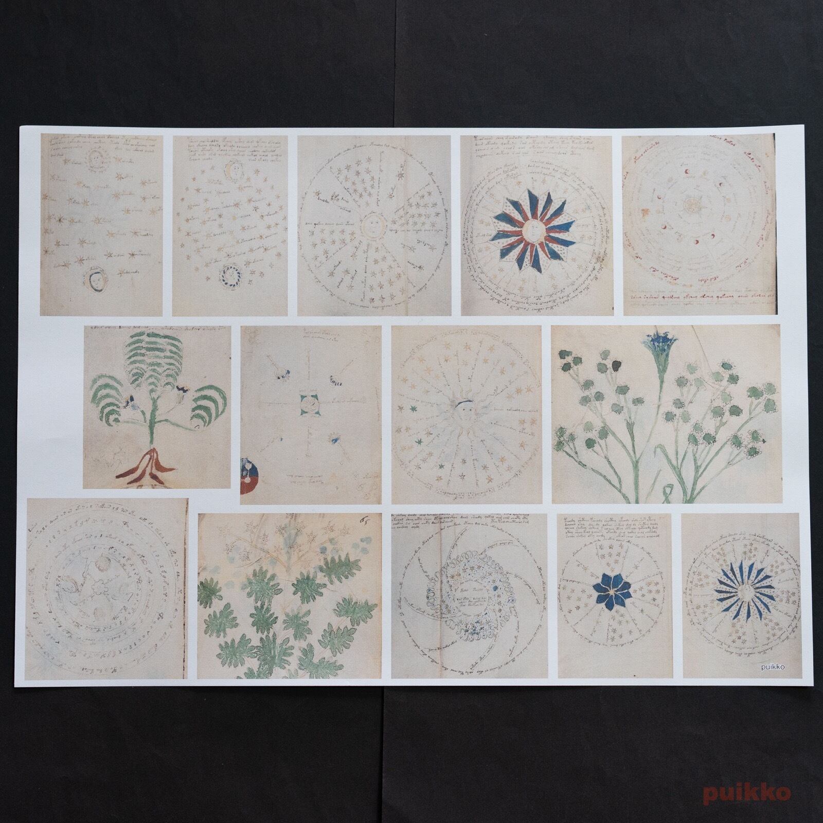「ヴォイニッチ手稿」に描かれている多数のイラストのうち、植物の絵、天文学、占星術関連の絵の計54点を使ってレイアウトしました。