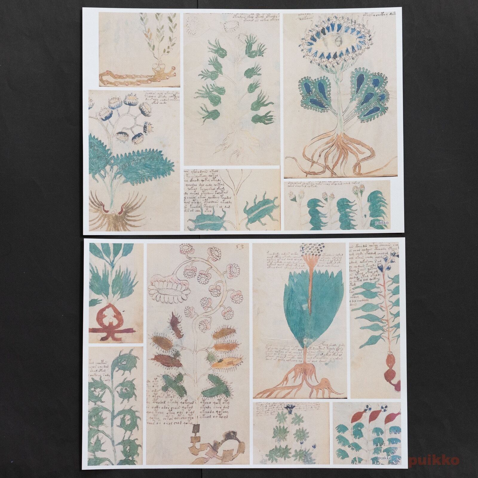 「ヴォイニッチ手稿」に描かれている多数のイラストのうち、植物の絵、天文学、占星術関連の絵の計39点を使ってレイアウトしました。