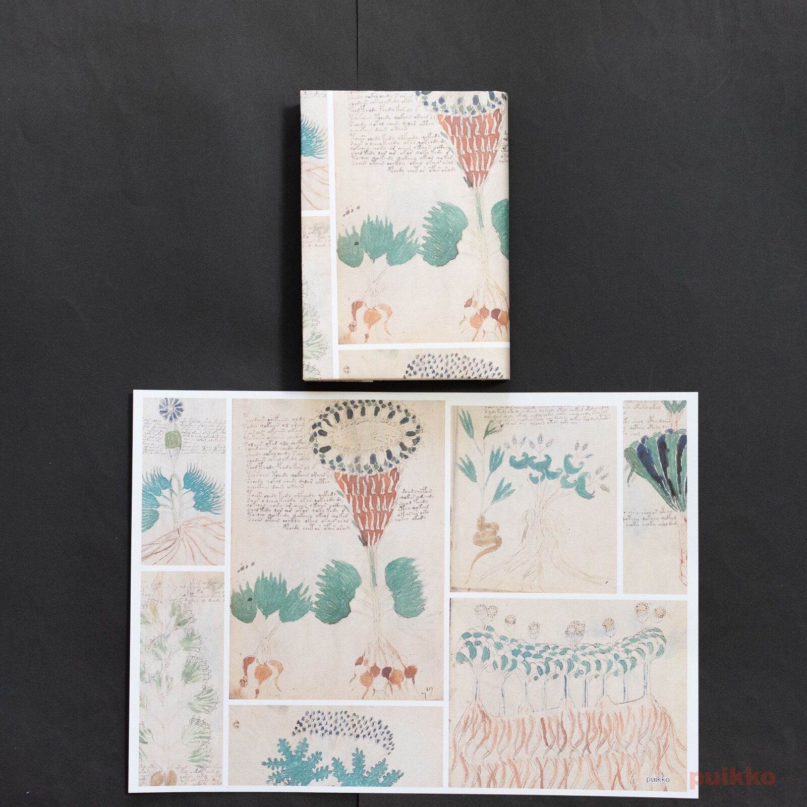 未解読の文字と奇妙な絵が描かれた奇書「ヴォイニッチ手稿」の一部をカラー印刷した紙製ブックカバーです。