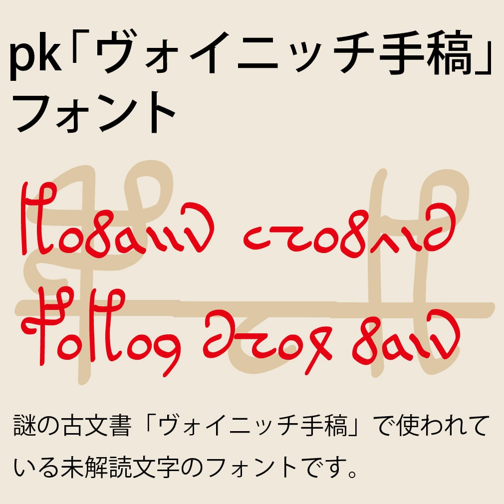 この文書の中で使われている文字をオリジナルフォントとして制作しました。文字の割り振りは、ヴォイニッチ手稿についてまとめたサイト「The Voynich Manuscript」で利用されているフォント「EVA hand1」に準拠しています(ただし「EVA hand1」の文字すべてに対応しているわけではありません)。英語アルファベットの小文字a〜z(wを除く)の25文字、大文字AFHIKOPSTYの10文字、数字0〜9、+(プラス)、"(ダブルクオーテーション)、'(シングルクオーテーション)、¥またはバックスラッシュの4文字にそれぞれヴォイニッチ手稿で使われている文字を割り当てています。