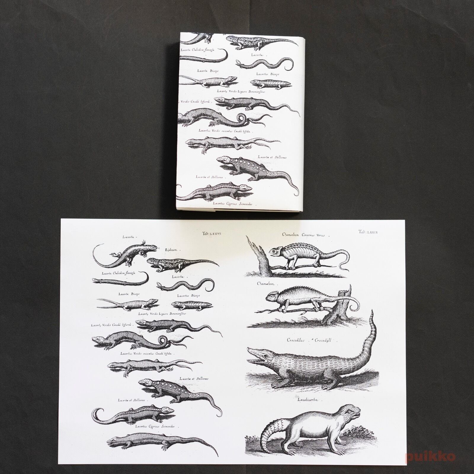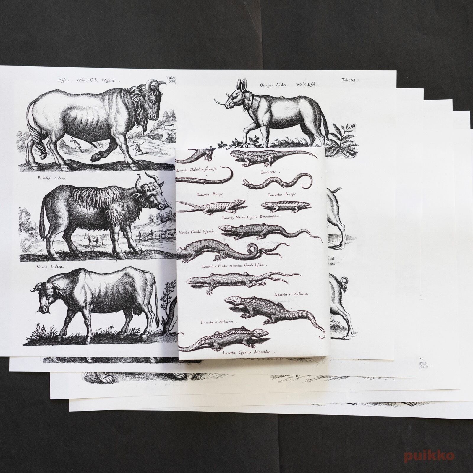 17世紀オランダの博物学者ヨハネス・ヨンストンが著した「鳥獣虫魚図譜」(Historiae Naturalis)は、獣、鳥、魚、虫など動物を銅版画で克明に描いた図鑑。全5巻にわたる図鑑のうち、Historiae Naturalis De Quadrupedibus Libri に掲載されている四足動物(哺乳類、爬虫類)の図版を用いて配置しました。