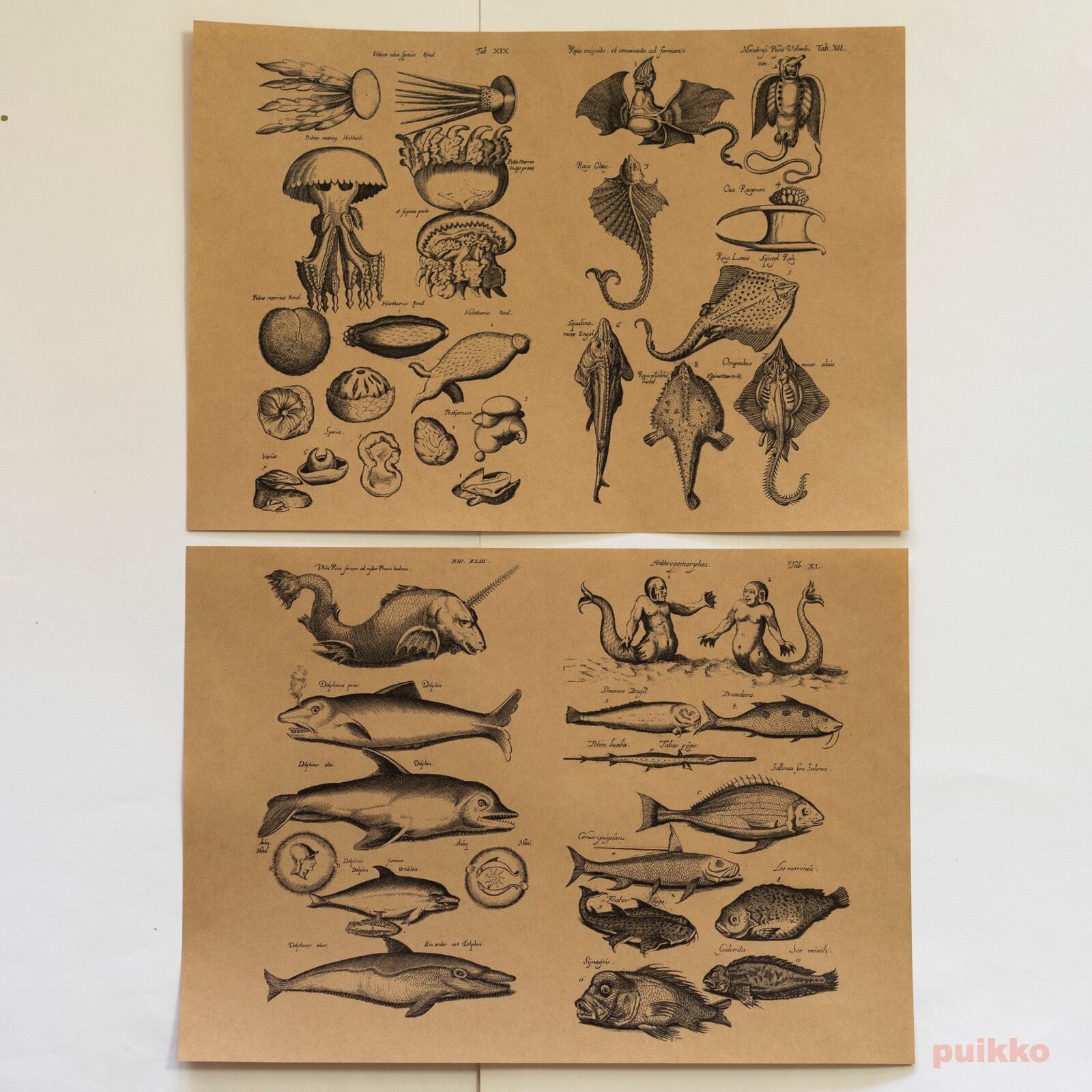17世紀オランダの博物学者ヨハネス・ヨンストンが著した「鳥獣虫魚図譜」(Historiae Naturalis)は、獣、鳥、魚、虫など動物を銅版画で克明に描いた図鑑。全5巻にわたる図鑑のうち、Historiae Naturalis De Piscibus Et Cetis Libri V および Historiae Naturalis De Exanguibus Aquaticis Libri IV に掲載されている魚、クジラ、水生生物の図版を用いて配置しました。