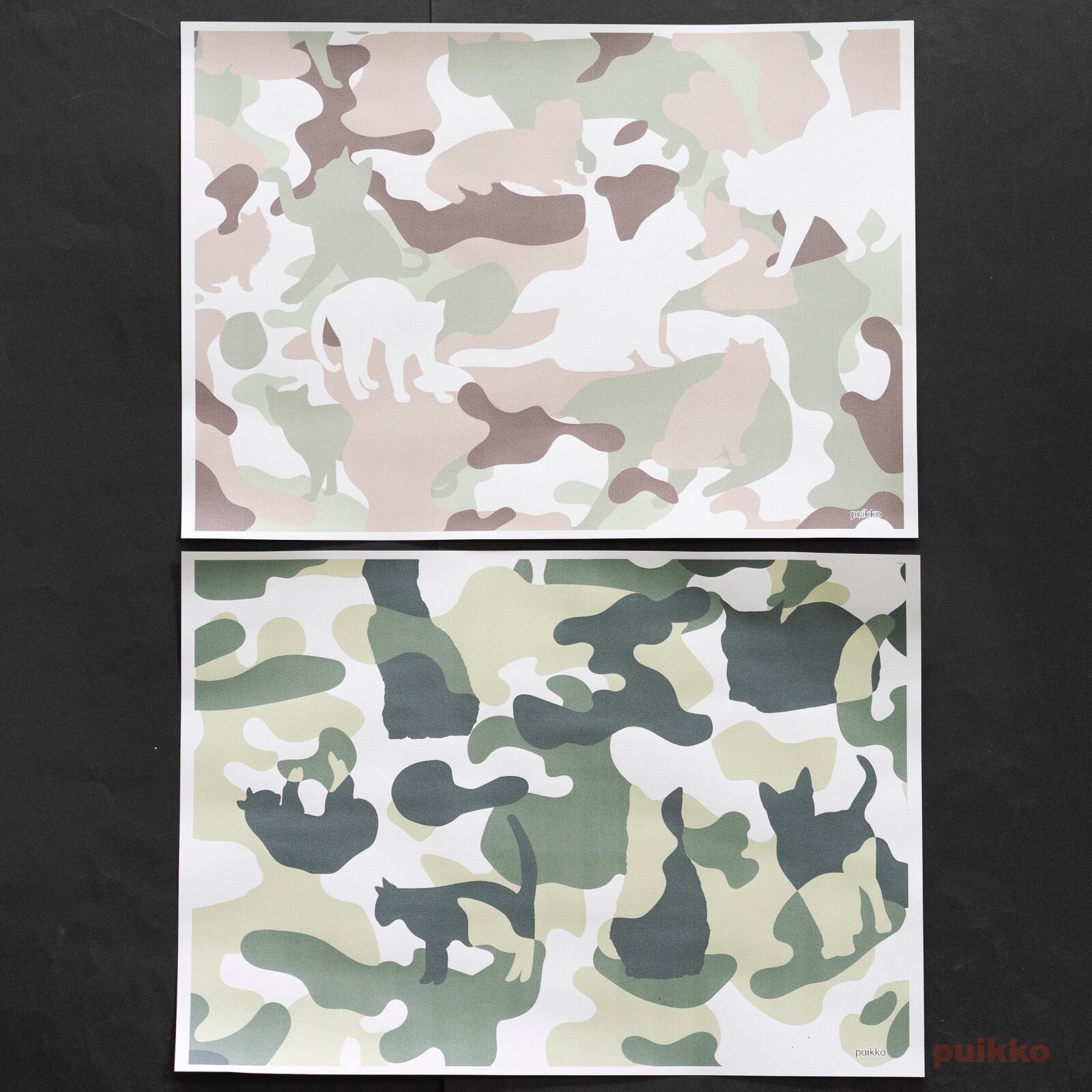 どの絵柄も猫のシルエットが迷彩柄の中にまぎれこんでいます。
