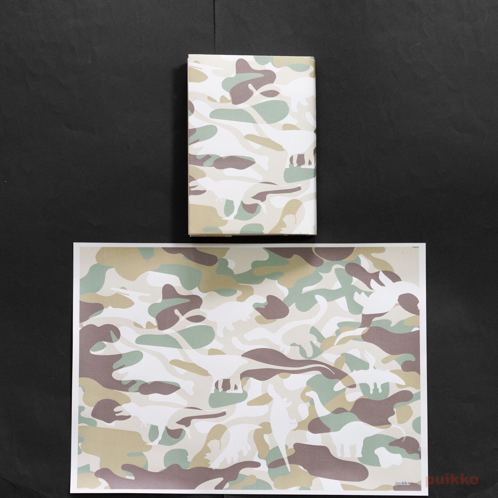 恐竜のシルエットの入った迷彩柄の紙製ブックカバーです。