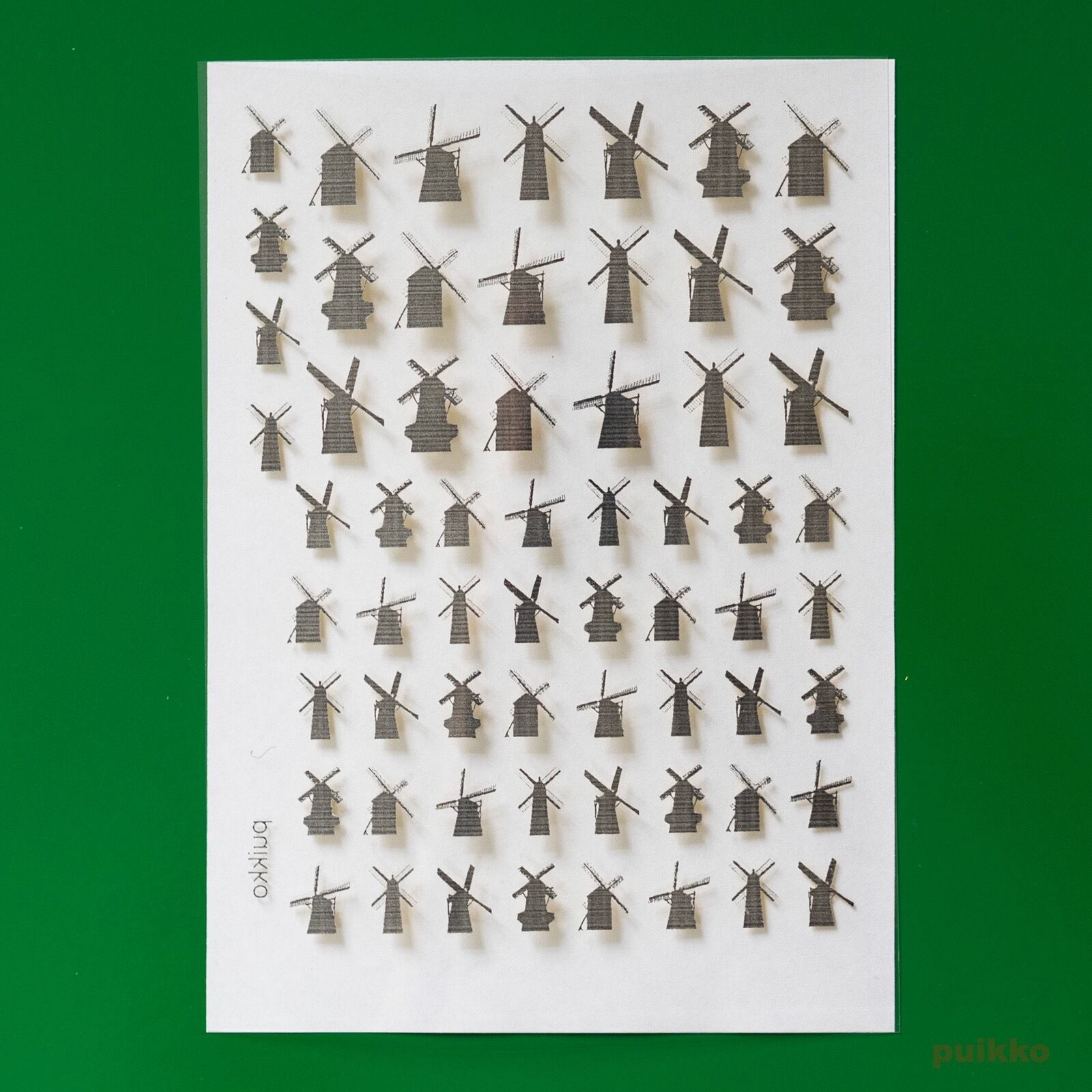 風車(ふうしゃ)のシルエットイラストをOHPフィルムにモノクロで印刷し、金の箔を押しました。