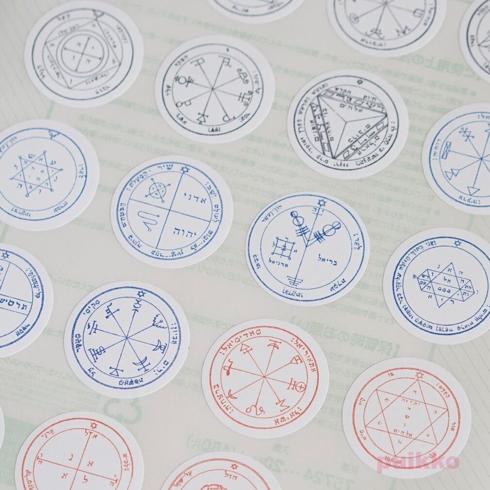 魔導書「ソロモンの大いなる鍵」に記されている七惑星のペンタクル(護符)のうち土星、木星、火星の護符21種をラベルシールにカラー印刷しました。