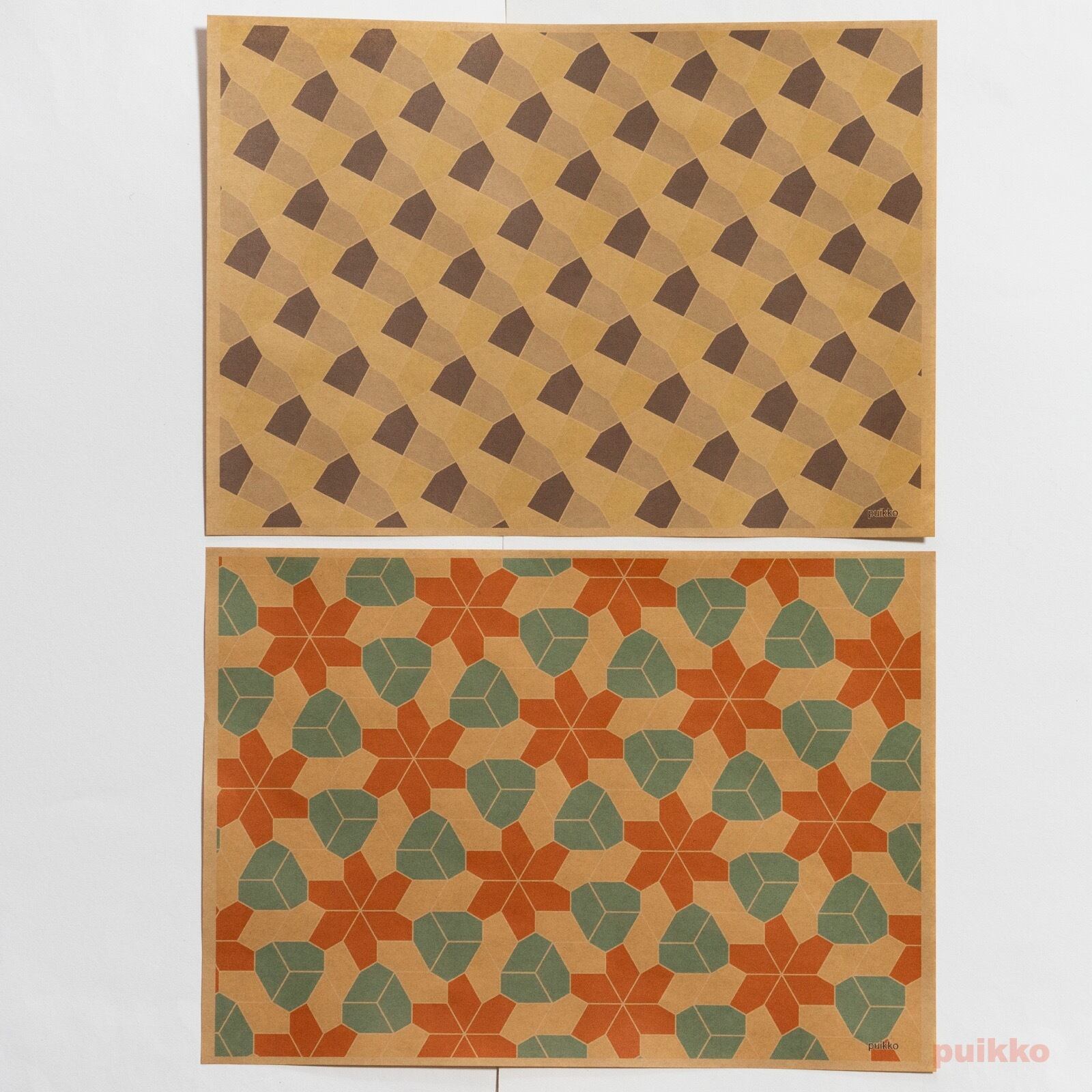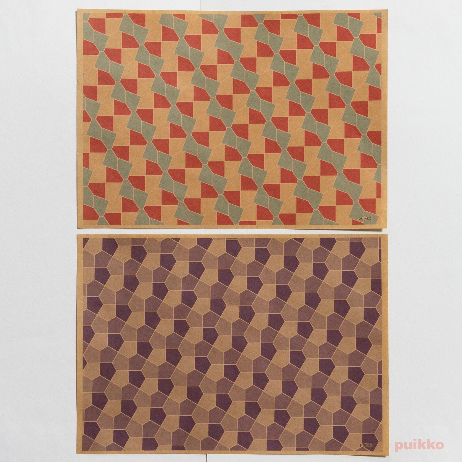 使用した用紙はクラフト紙(ブラウン)と再生紙(コピー紙よりやや厚く、黄味がかった白)の2タイプ。お好みのほうをお選びください。ブックカバーとして使うだけでなく、小物の包装紙、写真撮影の背景紙などアイデア次第でいろいろ活用できます。折らずに発送します。
