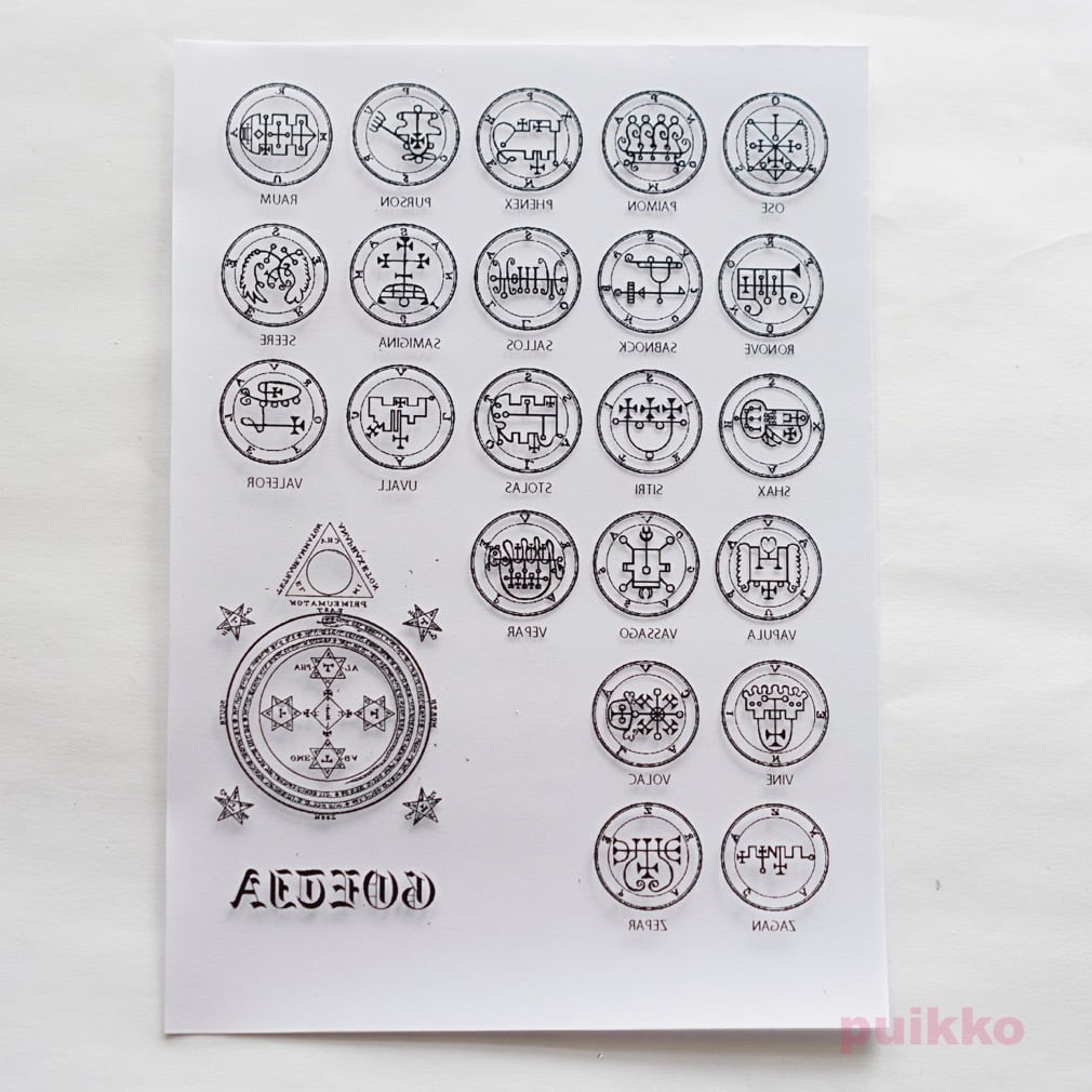 17世紀より伝わる作者不明の魔導書「レメゲトン」の第一書「ゴエティア」に記されている悪魔の印章。ソロモン王によって封印されたとされる72柱の悪魔に対応。このフィルムではアルファベット順でOSEからZEPARまでの22点とマジカルトライアングル、マジカルサークルを収録しています。