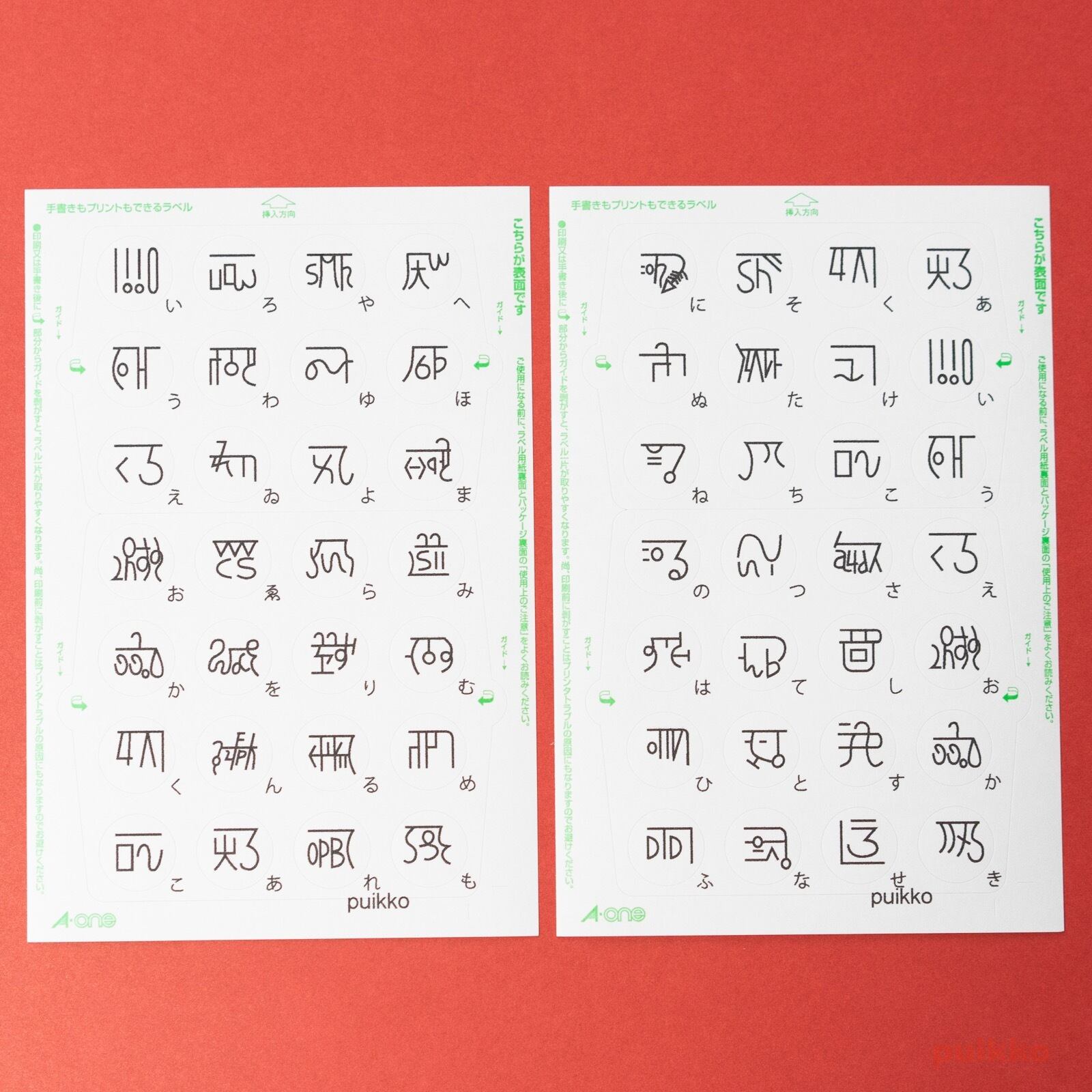 ラベルに龍体文字48文字(ゐゑ含む)を印刷し、余白に対応するひらがなを添えました。