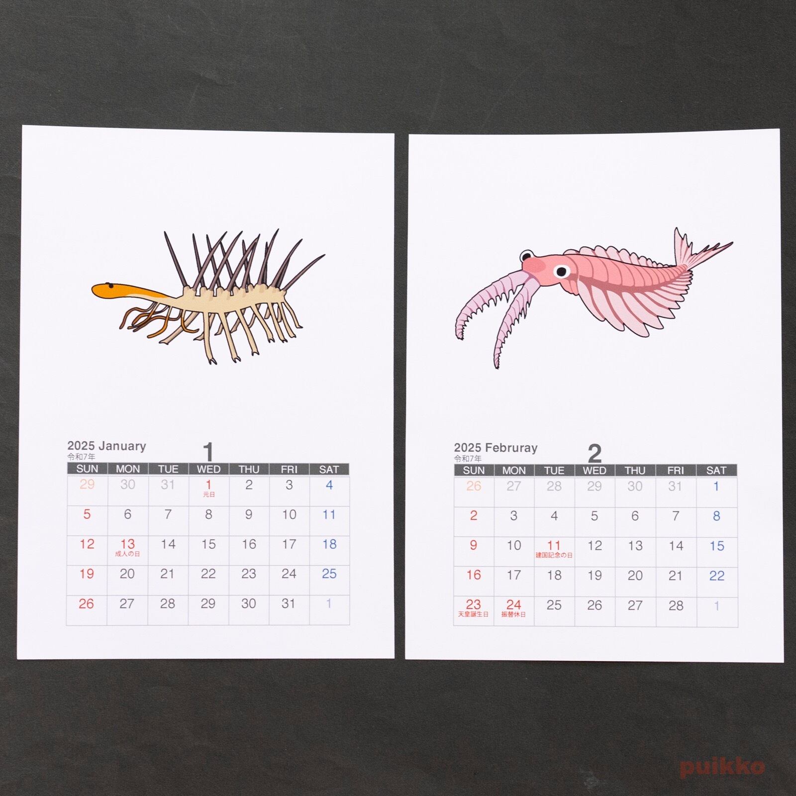 古生代の生物のイラストを使った壁掛けタイプのカレンダーです。