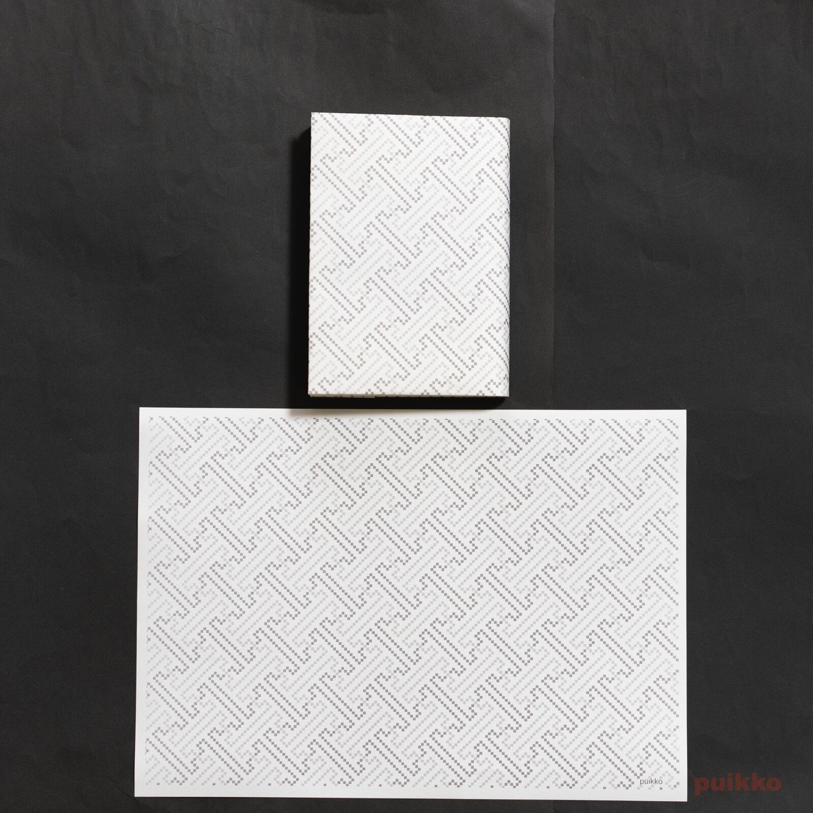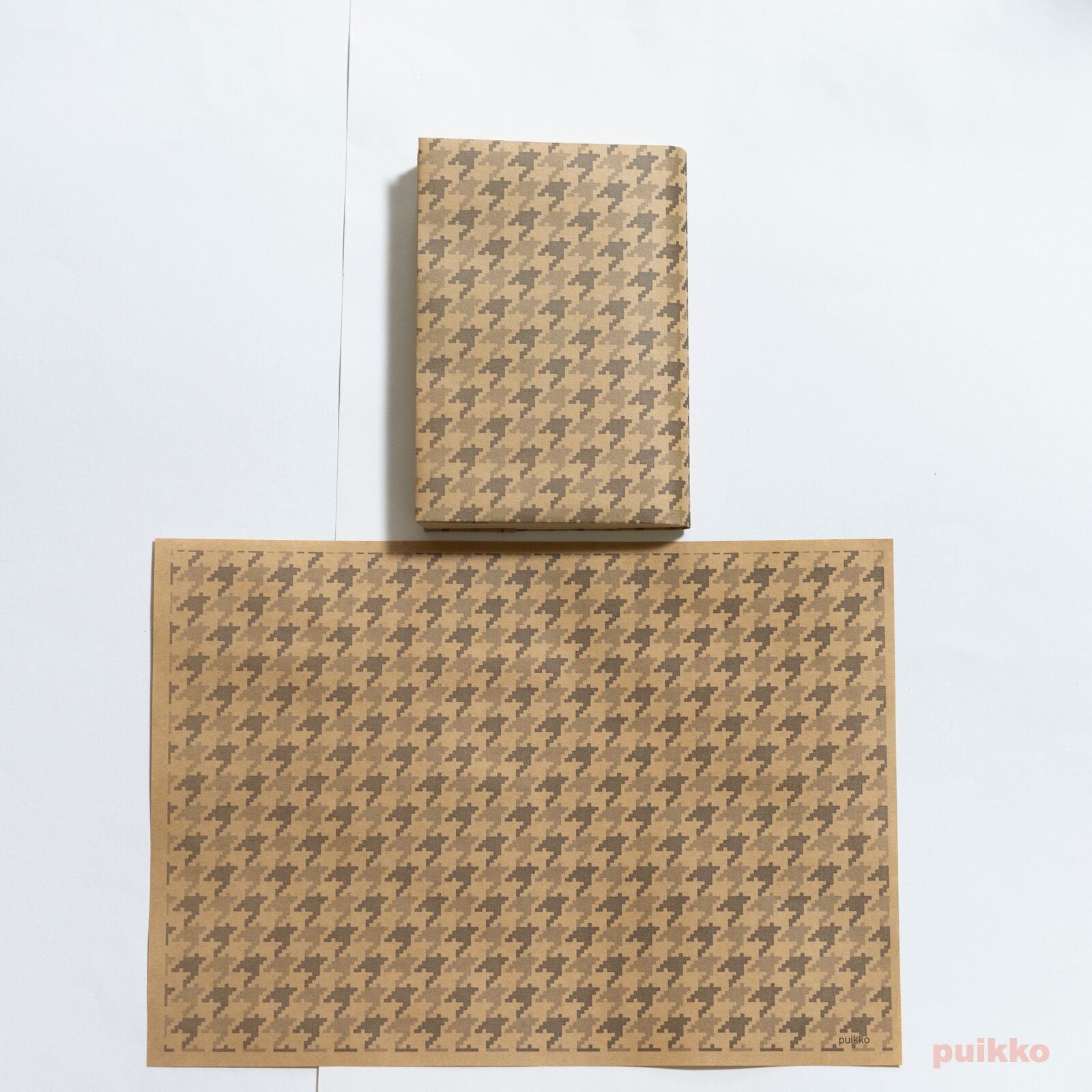 使用した用紙はクラフト紙(ブラウン)と再生紙(コピー紙よりやや厚く、黄味がかった白)の2タイプ。お好みのほうをお選びください。ブックカバーとして使うだけでなく、小物の包装紙、写真撮影の背景紙などアイデア次第でいろいろ活用できます。折らずに発送します。