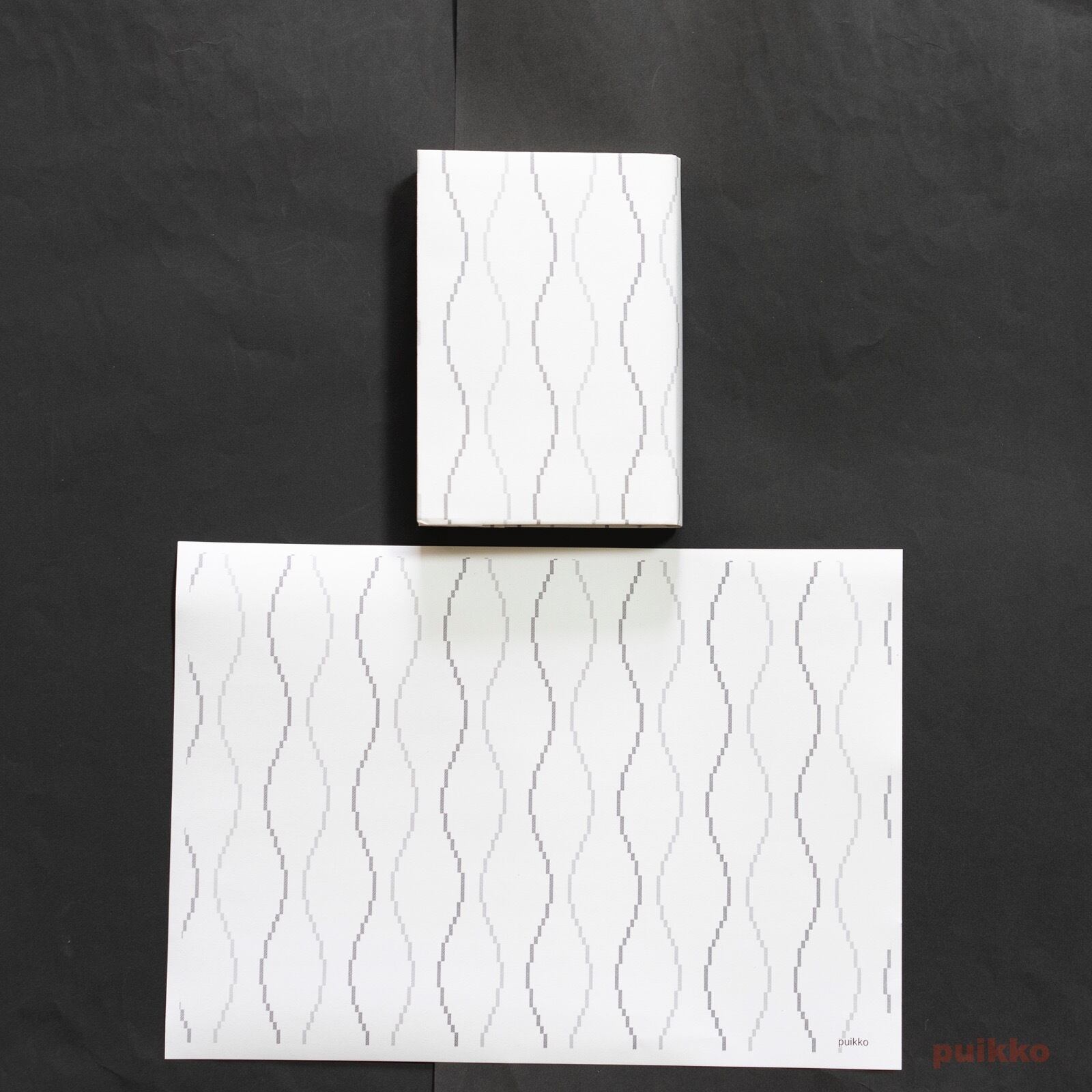 使用した用紙はクラフト紙(ブラウン)と再生紙(コピー紙よりやや厚く、黄味がかった白)の2タイプ。お好みのほうをお選びください。ブックカバーとして使うだけでなく、小物の包装紙、写真撮影の背景紙などアイデア次第でいろいろ活用できます。折らずに発送します。