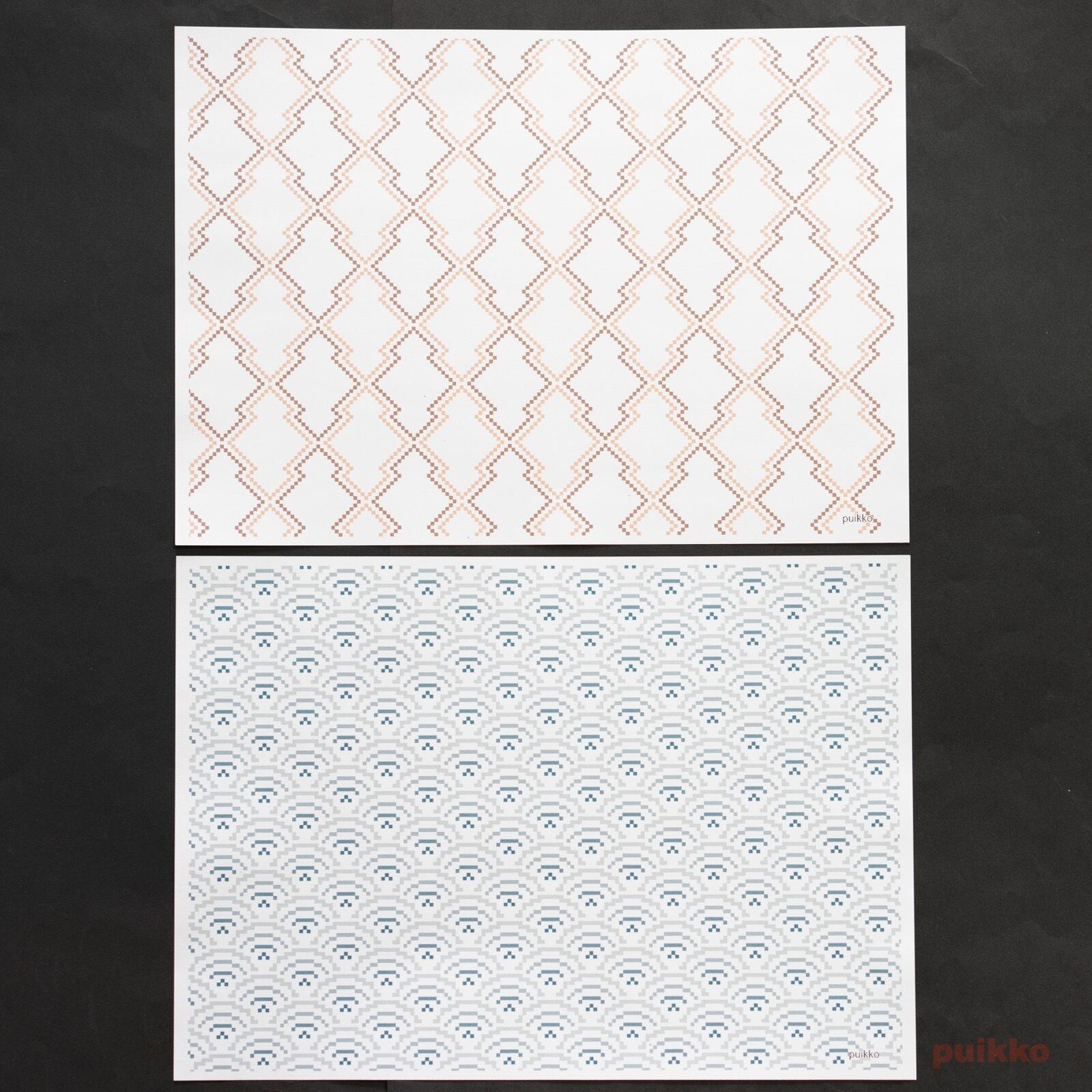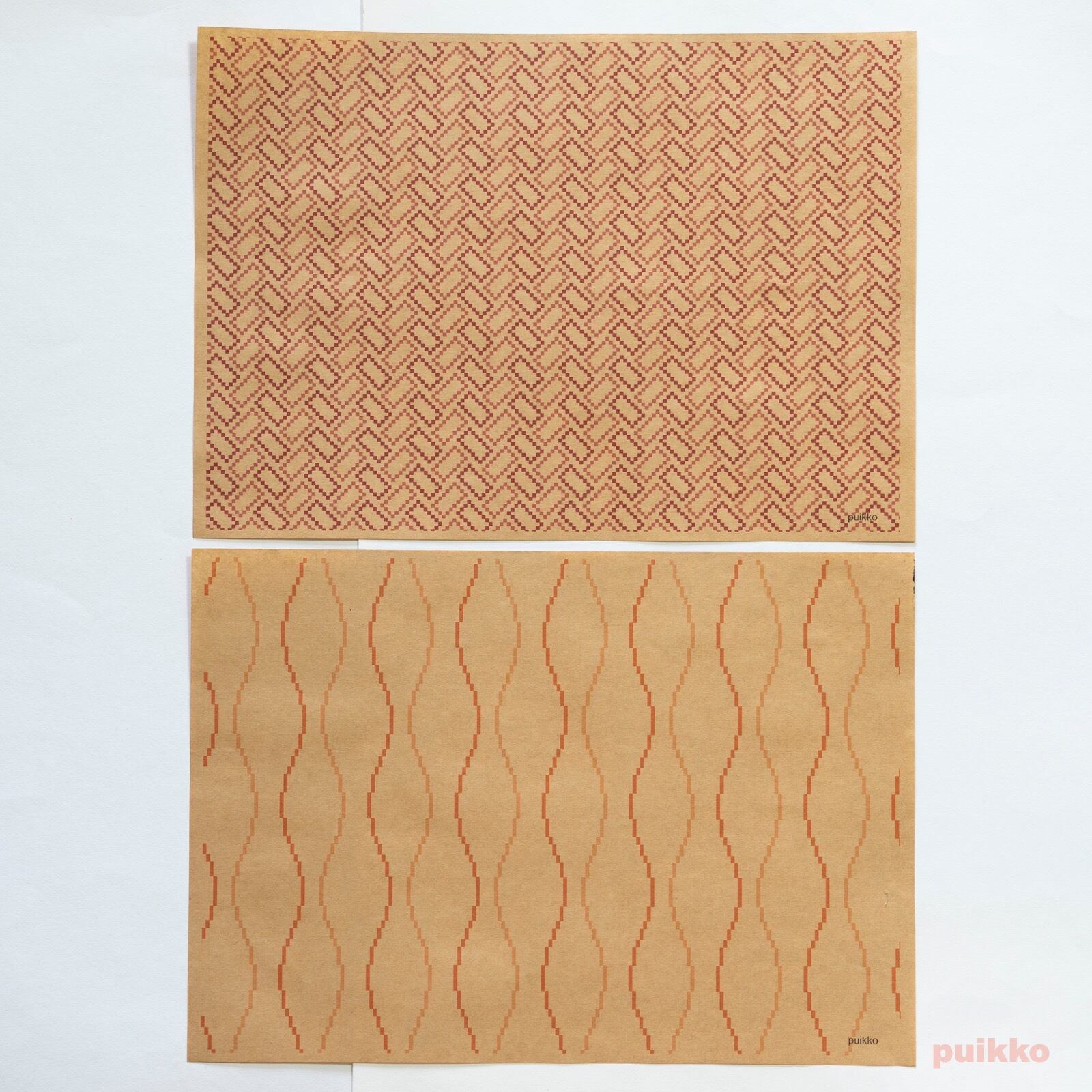 使用した用紙はクラフト紙(ブラウン)と再生紙(コピー紙よりやや厚く、黄味がかった白)の2タイプ。お好みのほうをお選びください。ブックカバーとして使うだけでなく、小物の包装紙、写真撮影の背景紙などアイデア次第でいろいろ活用できます。折らずに発送します。