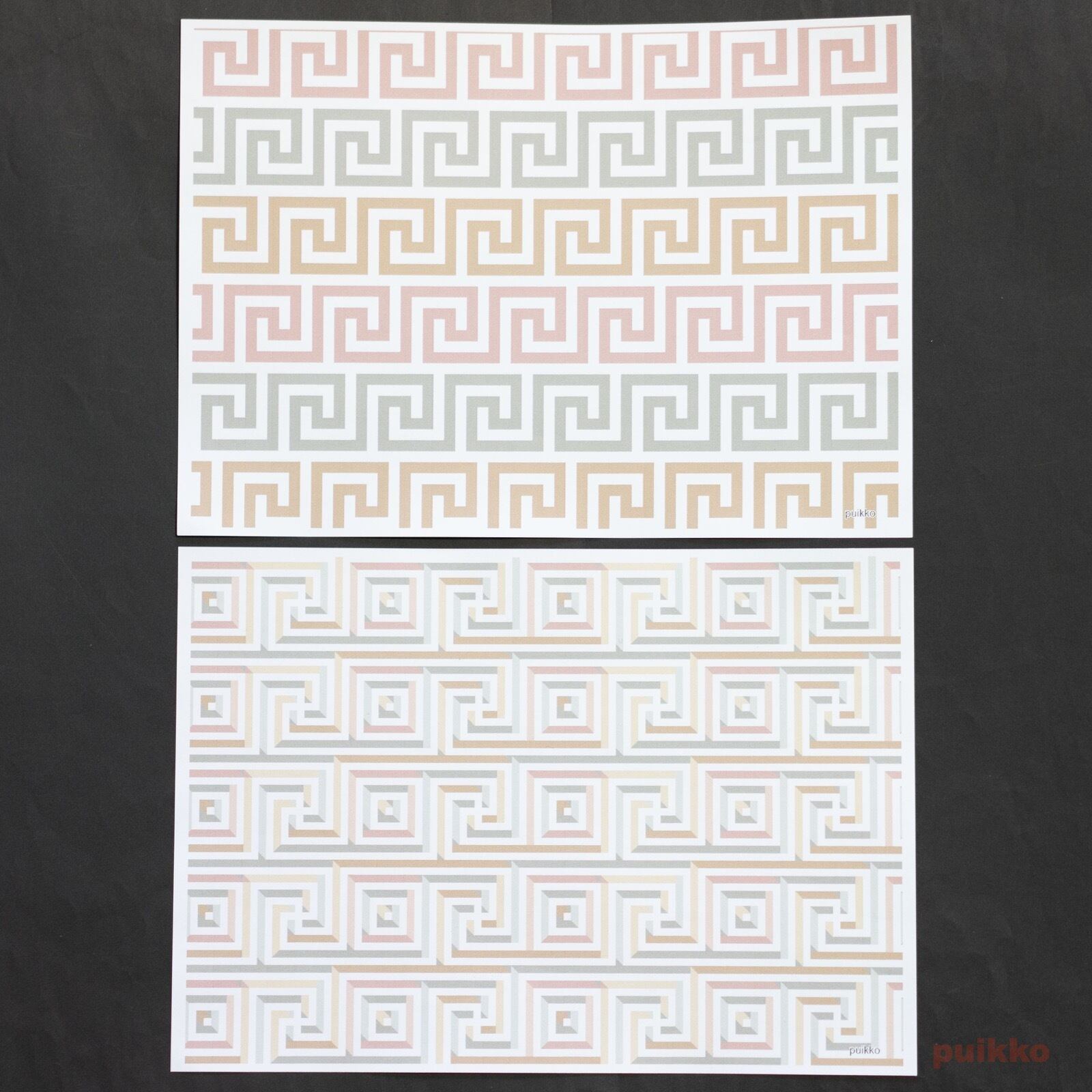 ギリシャ雷文とは、直角に折れ曲がる線を横に繰り返し連続させた装飾模様。メアンダー、メアンドロス模様、メアンドロス柄とも呼ばれます。